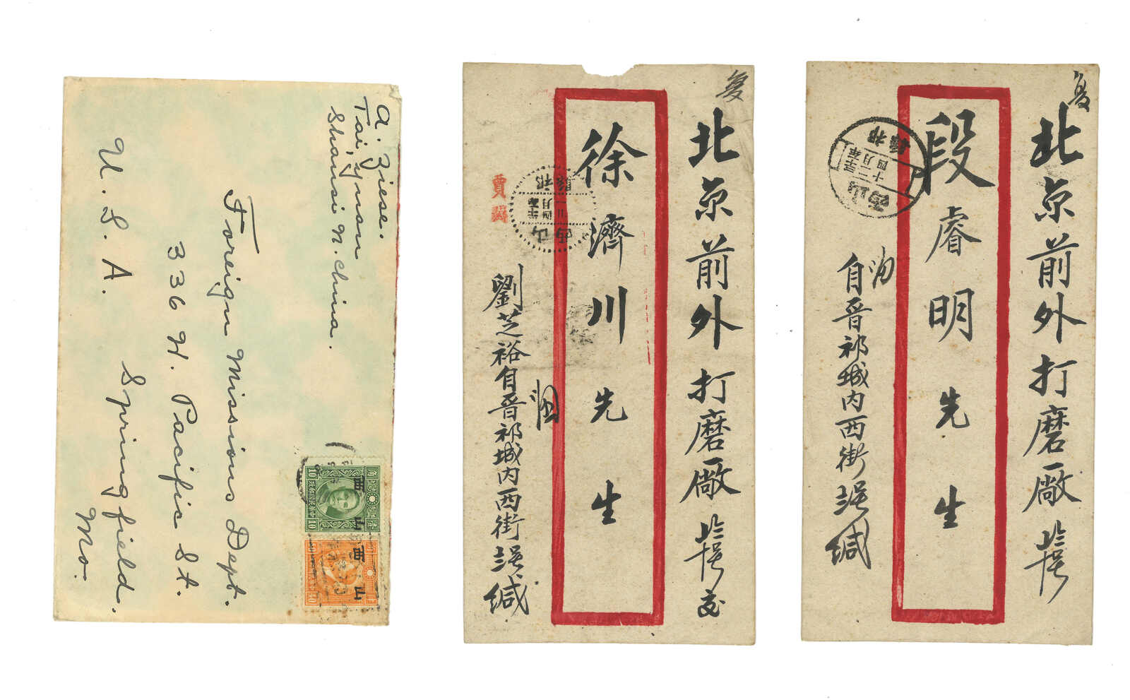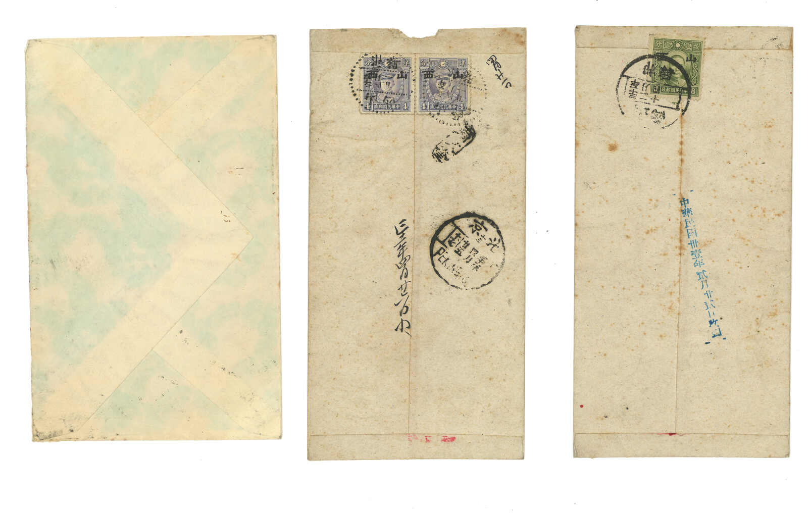 1942年一組三件貼用加蓋“山西”孫像及烈士票之實寄封,展示了8分外埠及5角國外郵資。貼六區票寄國外者較少見。(Image 1)