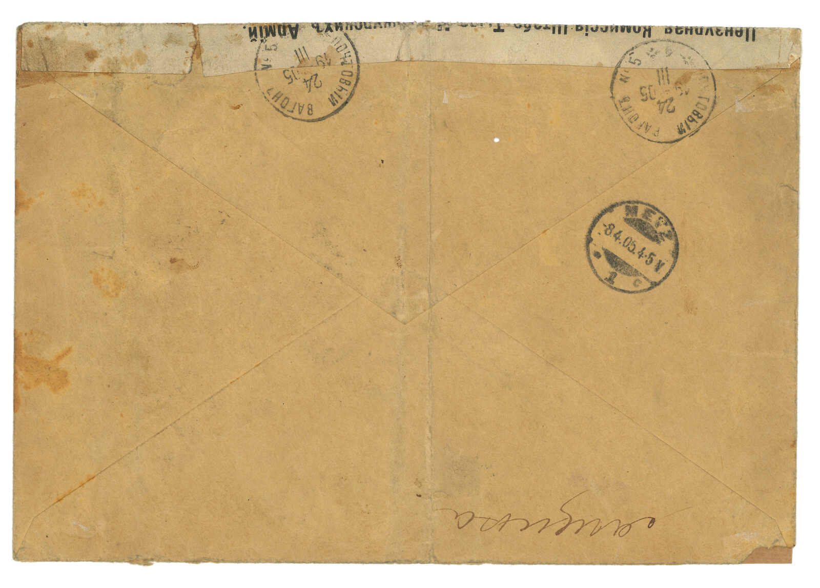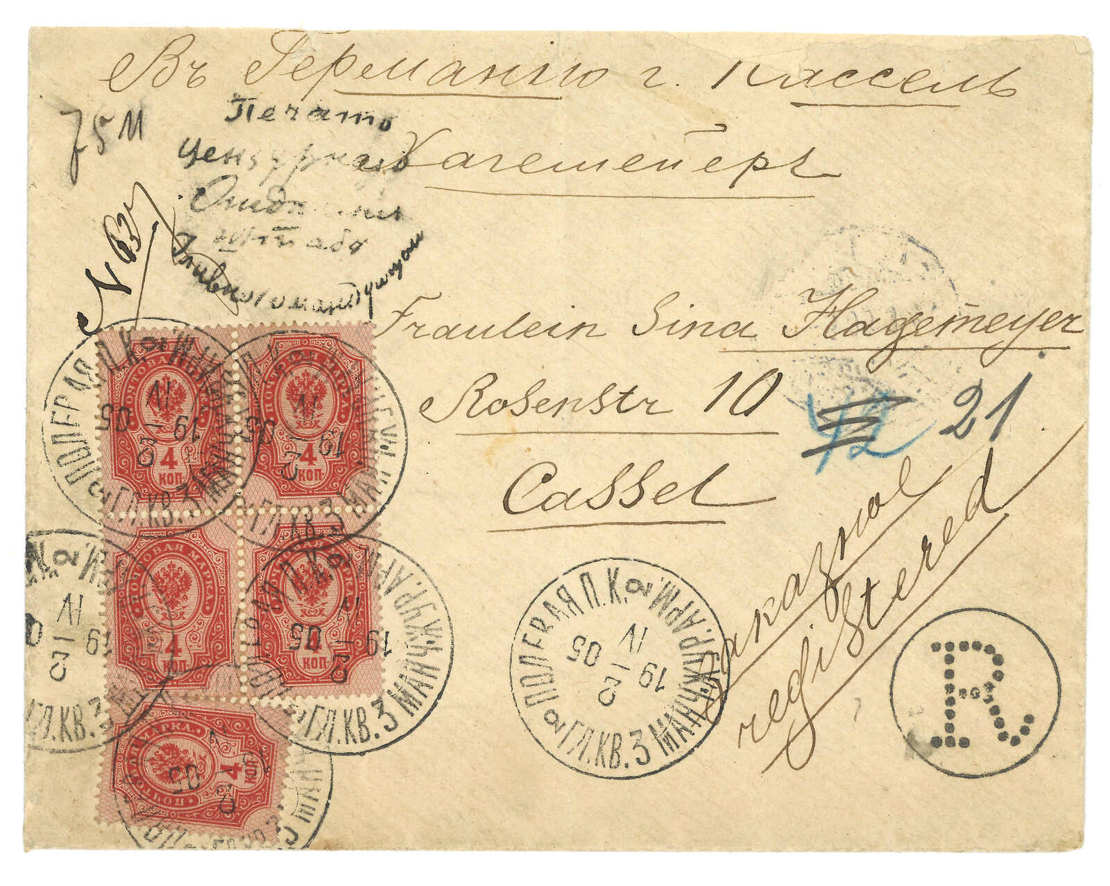 1905 (2 Apr) Russian 3rd Manchurian Army (2 Apr) to Germany, f.w. Russian Coat of Arms 4k x5, tied by scarce Headquarter Field Post and Telegraph Office, 3rd Manchurian Army cds. Transit Headquarter FPO (4 Apr). Showing R mark