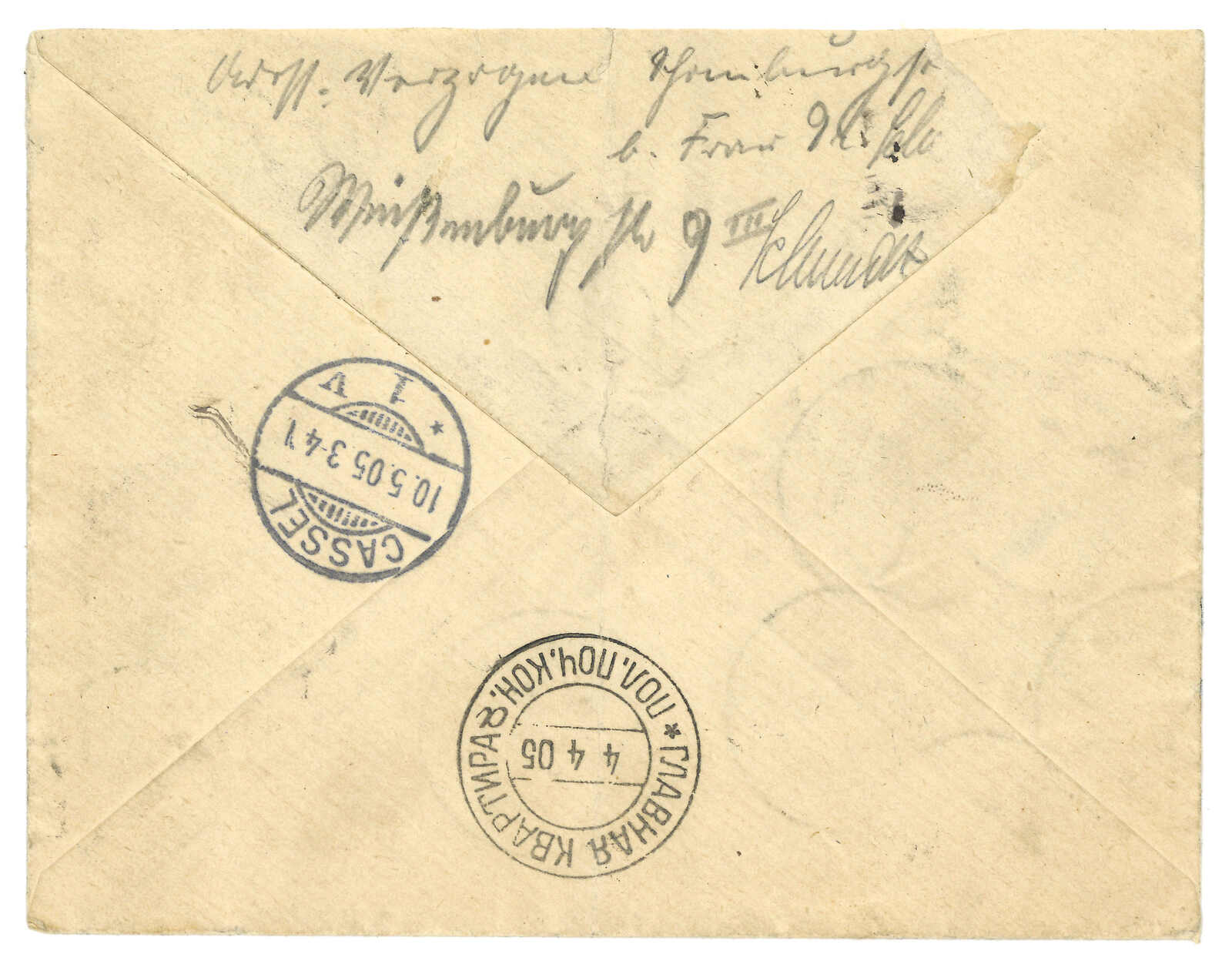 and censor seal. Arrived Cassel (10 May). The HQ FPTO was located at Szepingkai by the time of sending this cover. Scarce.