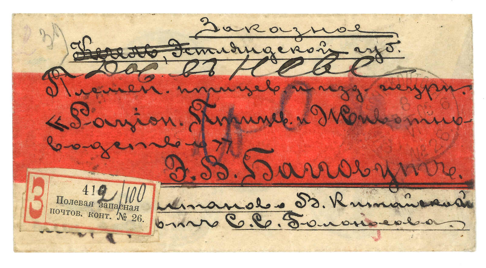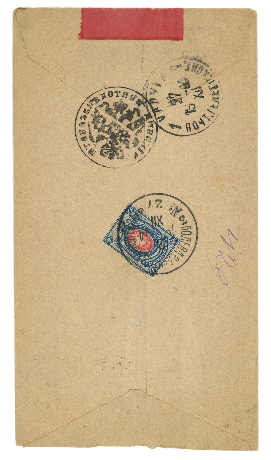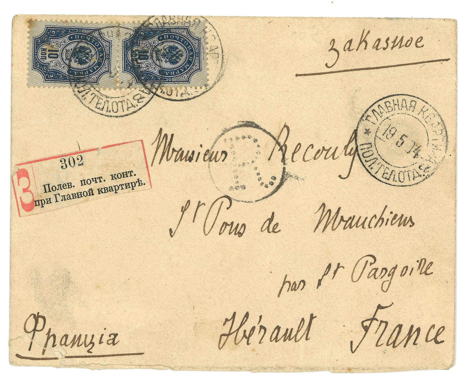 1904.5.19 總部野戰電報分局寄法國。掛號封,貼軍徽圖10戈比,旁貼總部隸屬野戰局掛號標籤。 背面蓋有“遠東總督總部野戰參謀部”圓戳及方型檢查章。稀罕難得。(Image 1)