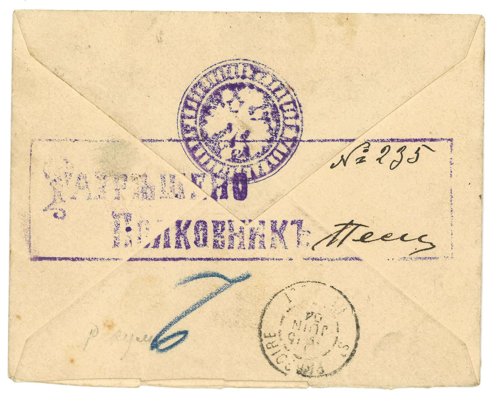 1905.7.7 俄國軍郵封,自哈爾濱寄阿爾及利亞,背貼軍徽圖3戈比 + 7戈比,銷哈爾濱野戰總局T&S 7B型日戳。背面鈐紫色檢查圓章。 8.11抵阿爾及爾。封剖開以作展示。(Image 1)