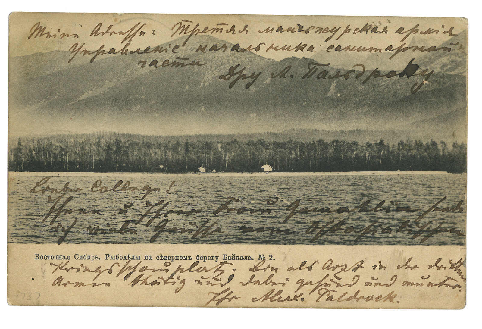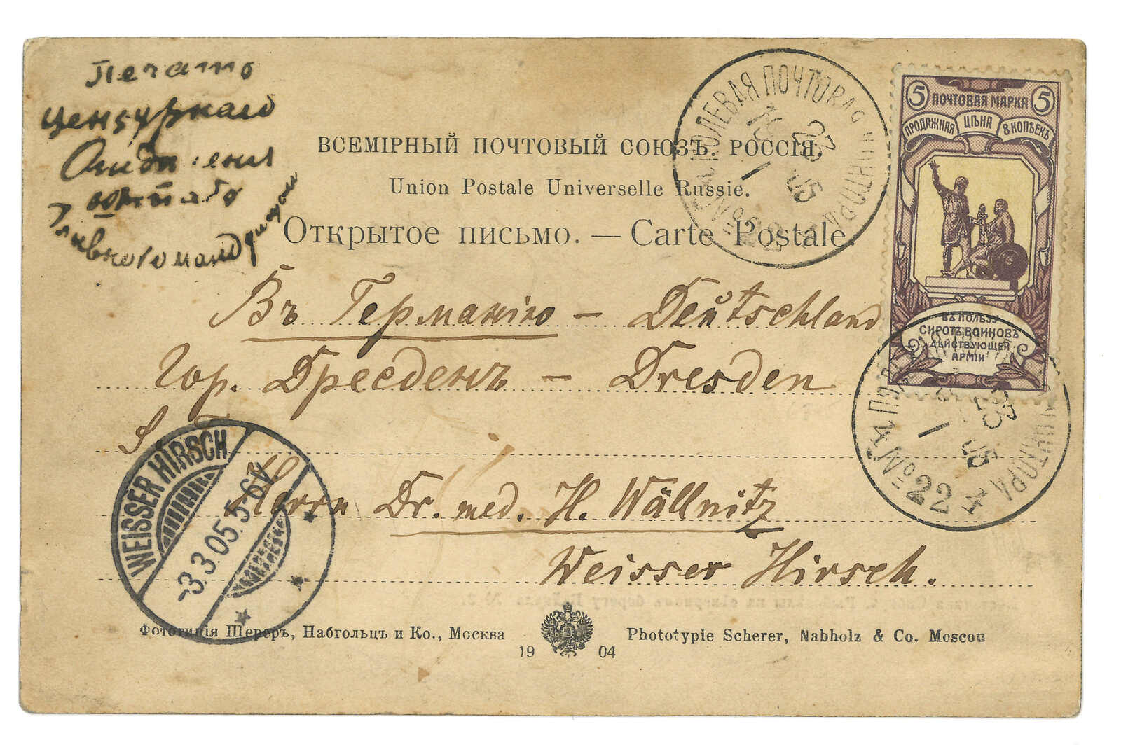 1905.1.23 圖片明信片,由第三滿洲軍醫療部的主管寄德國,貼賑濟孤兒5戈比,銷軍郵22局4號日號,旁鈐滿洲手寫體檢查章。貼用賑孤兒票之郵例極少見於俄國境外。(Image 1)