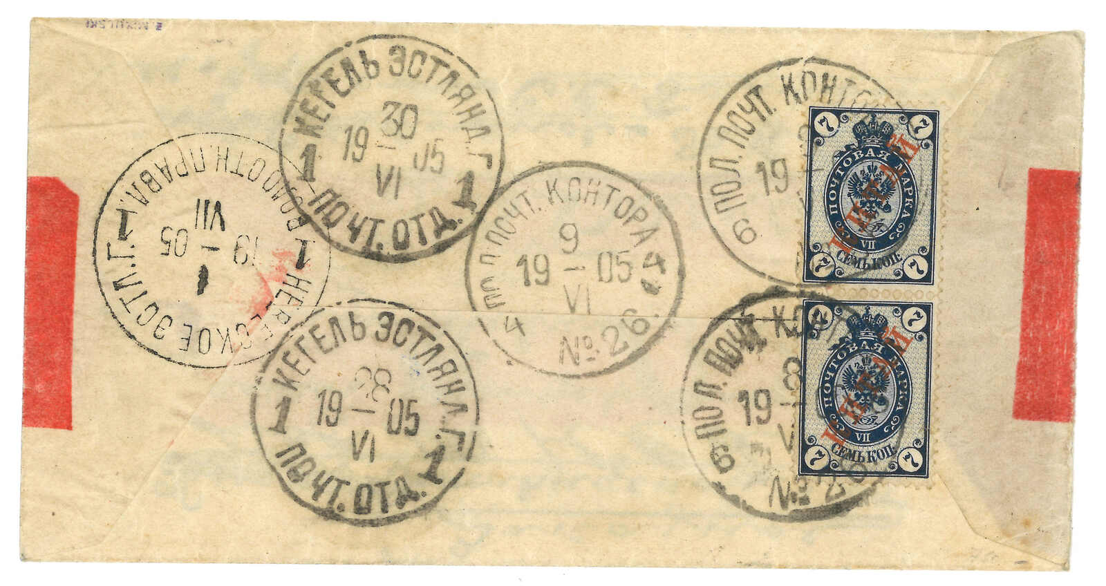 1905.7.8 紅條封自軍郵26局寄愛沙尼亞,貼軍徽圖加蓋KITAI 7戈比雙連,銷軍郵26局6字及4字日戳。6.30抵Kegel。 掛號軍郵封貼用加蓋KITAI票相當少見,軍郵26局之郵局亦甚少見。(Image