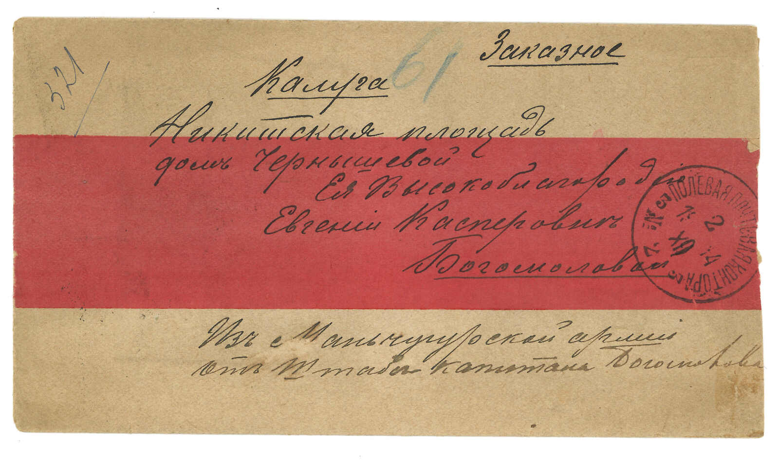 1904 (2 Dec) Red band cover from a captain of the Manchurian Army to Kaluga, Russia, f.w. Coat of Arms 14k on reverse, tied by FPO No. 27 index 3 cds. Example of Chinese Eastern Railway.