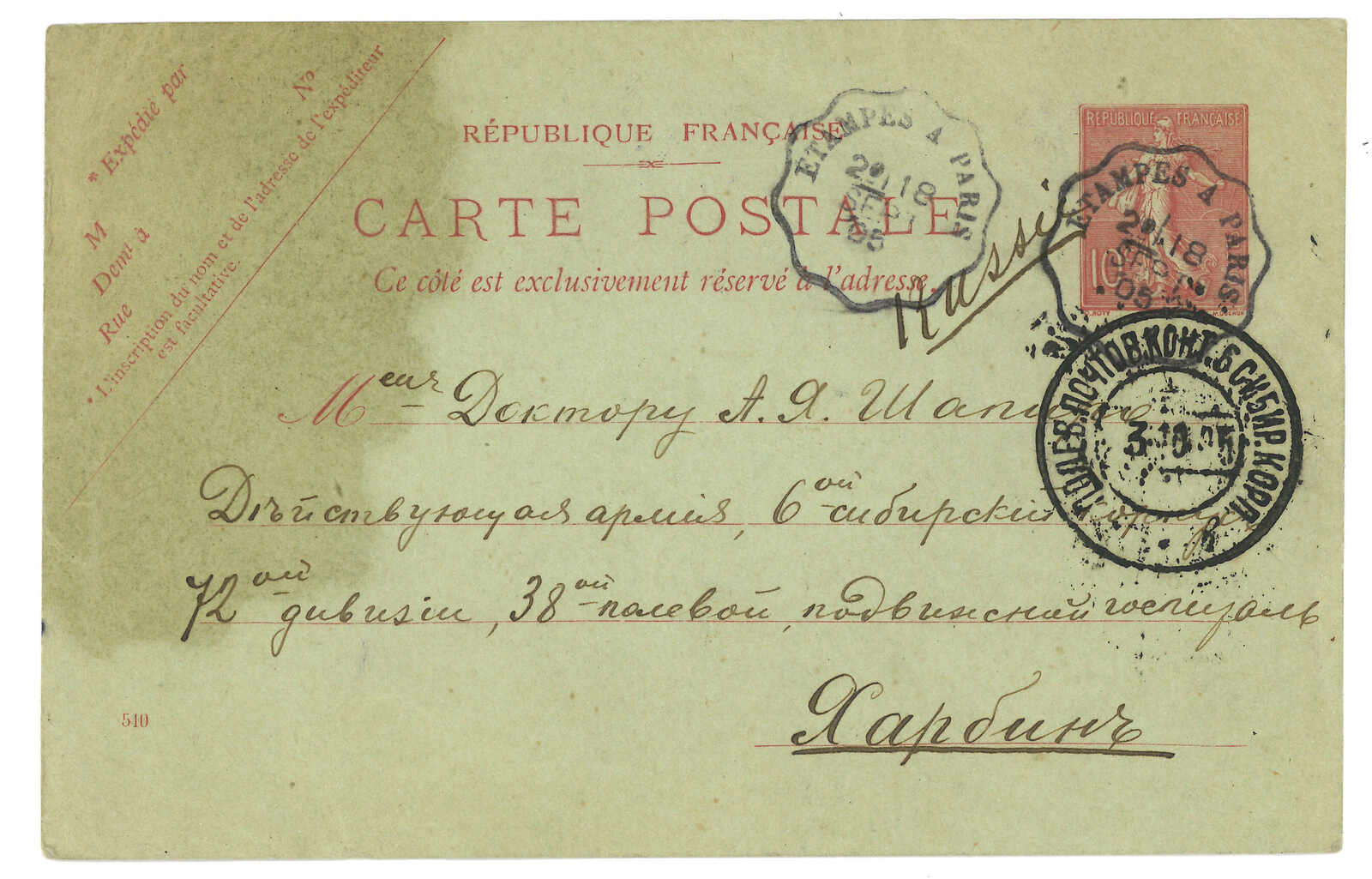 1905.9.18 法國10生丁郵資片寄哈爾濱第三十八流動醫院的一名醫生,銷Etamps a Paris 日戳。10.3抵達, 鈐西伯利亞軍團第6野戰軍郵局b字日戳。少見之西伯利亞軍團到達戳。(Image 1)