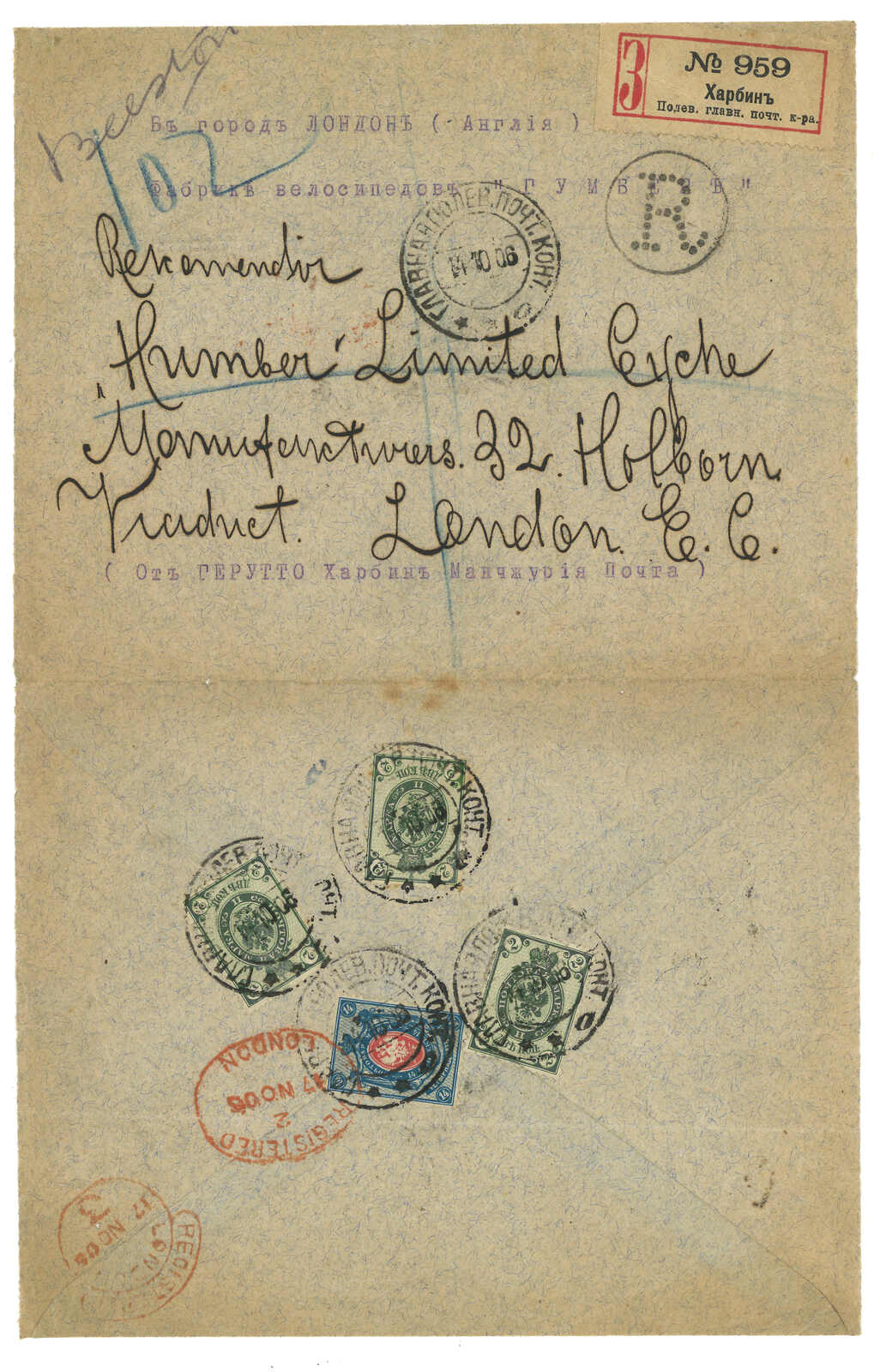 1906 Harbin (14 Oct) to England. Registered cover, f.w. Coat of Arms 14k + 3x 2k on reverse, tied by Harbin Head Field PO T&S type 7 cds., a longside with registered label. Arrived London (17 Nov). Scarce postmark as well