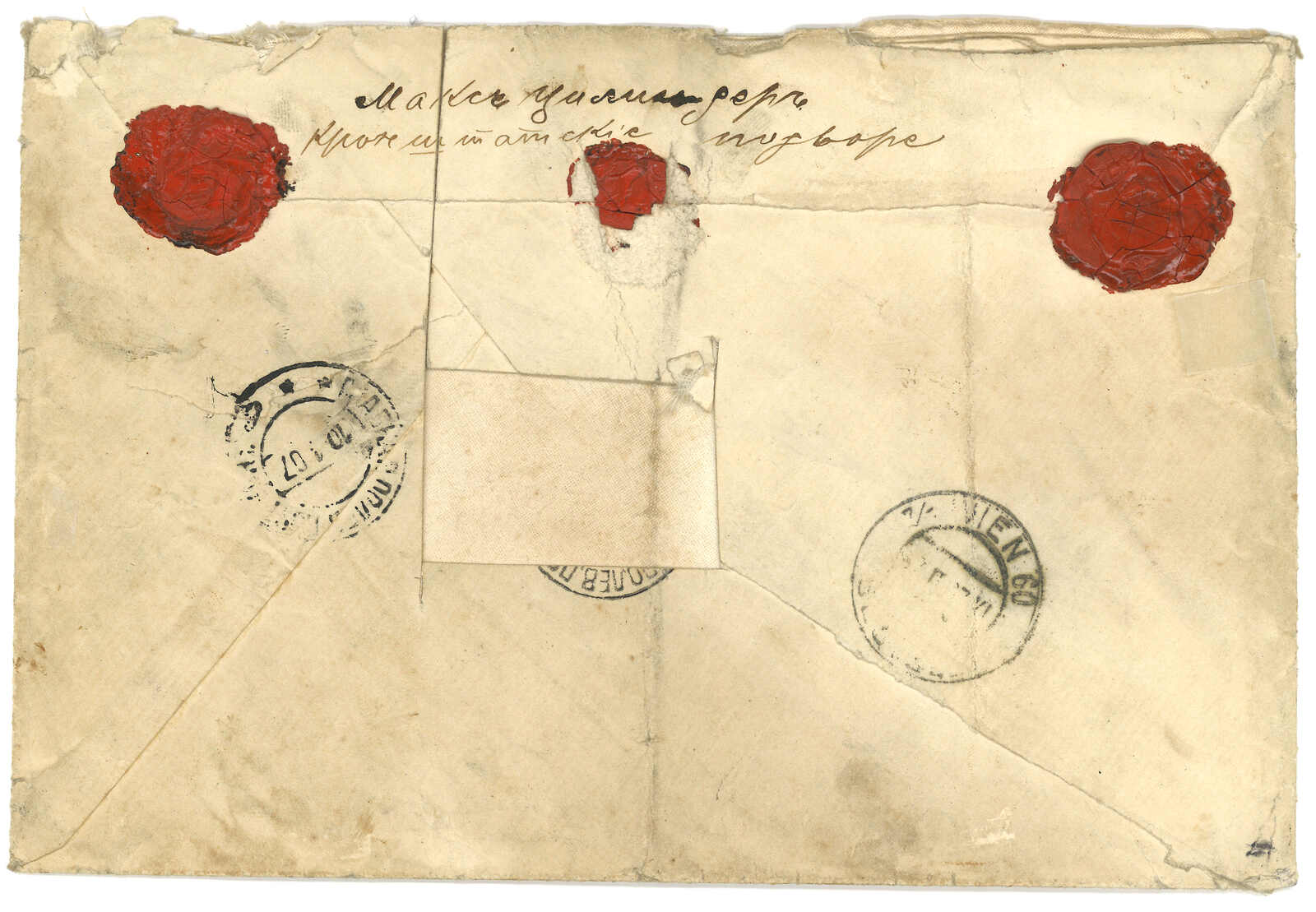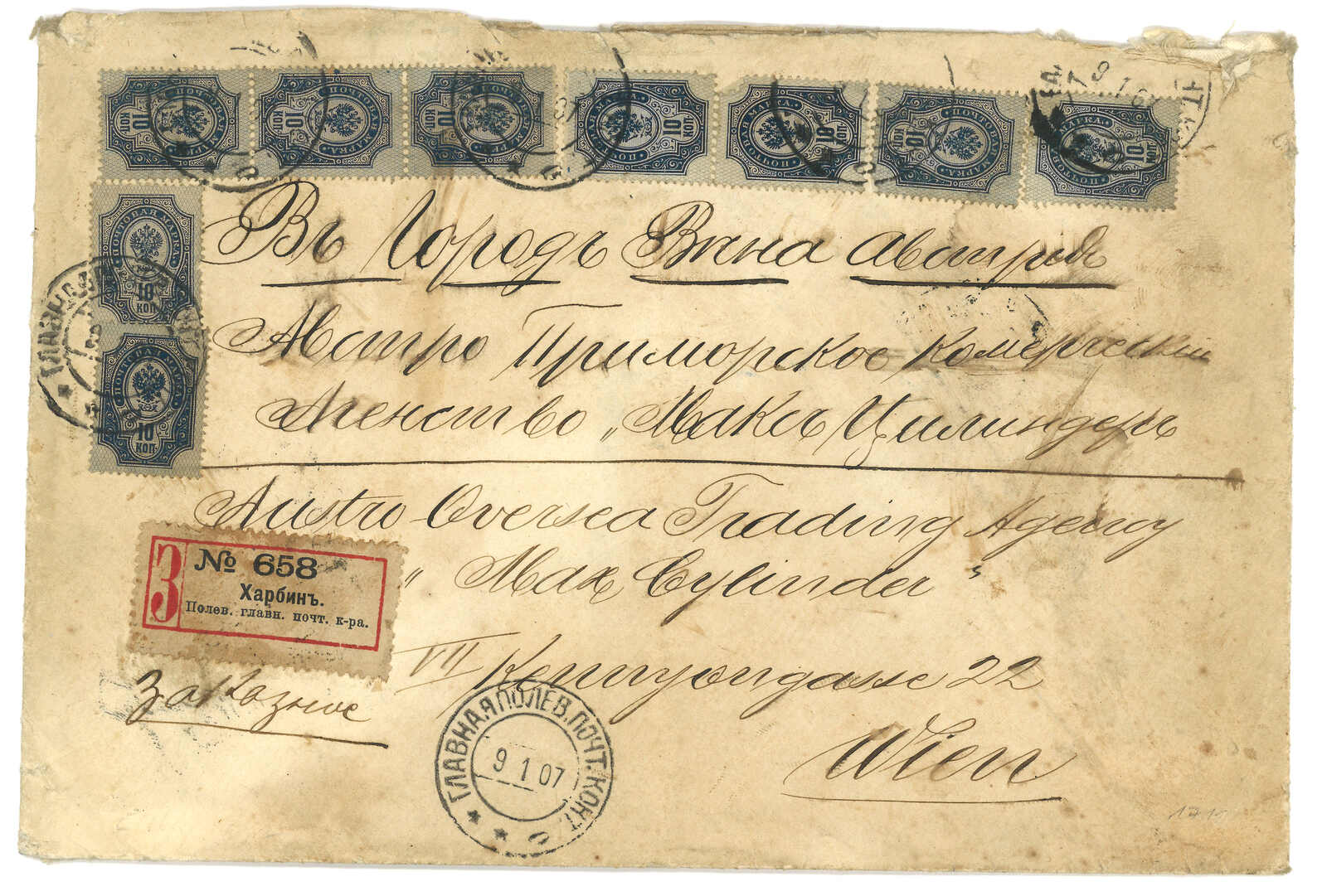 1907.1.9 哈爾濱寄奧國。掛號封,貼軍徽圖10戈比 x9,銷哈爾濱野戰總局T&S 7B型日戳,旁貼掛號標籤。抵維也納。郵戳及掛號標籤俱少見。背面火漆被移除。(Image 1)
