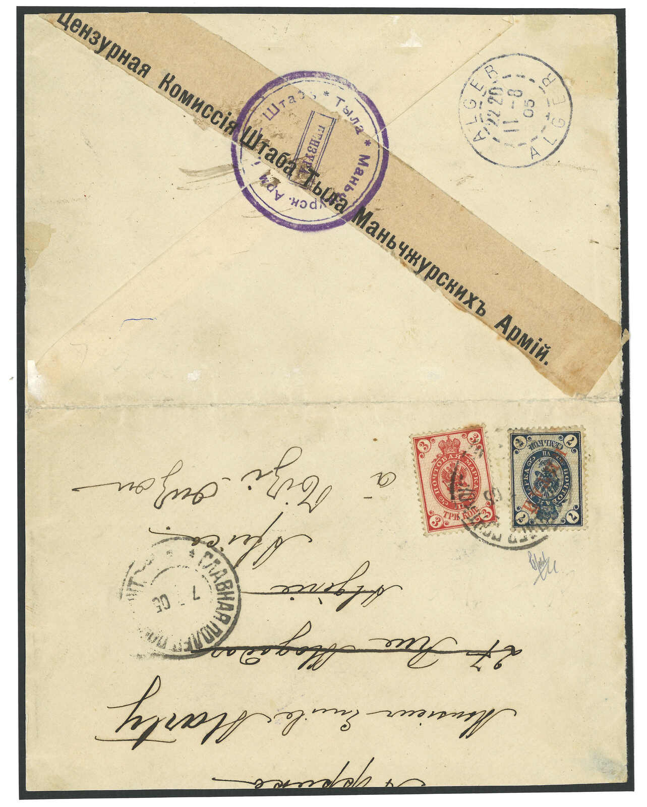 1905 (7 Jul) Russian military cover from Harbin to Algeria, f.w. Coat of Arms 3k + 7k, tied by Harbin Head Field PO T&S type 7B cds. On reverse with violet censor mark. Arrived Alger (11 Aug). Cover opened out for display.
