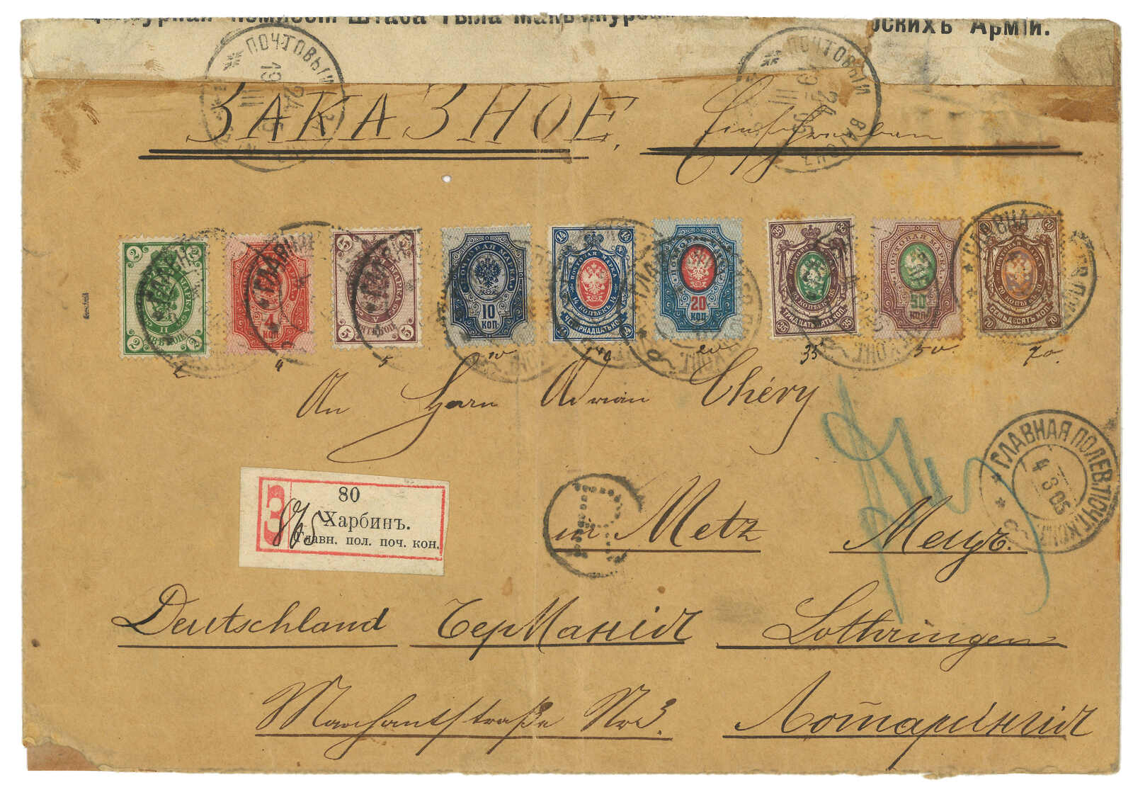 1905.3.3 哈爾濱寄德國。掛號封,貼軍徽圖自2戈比至70戈比共9枚,銷哈爾濱野戰總局7D型日戳,旁見掛號標籤及R章。 檢查及重封。3.24抵火車郵局5號。4.8抵Metz。(Image 1)