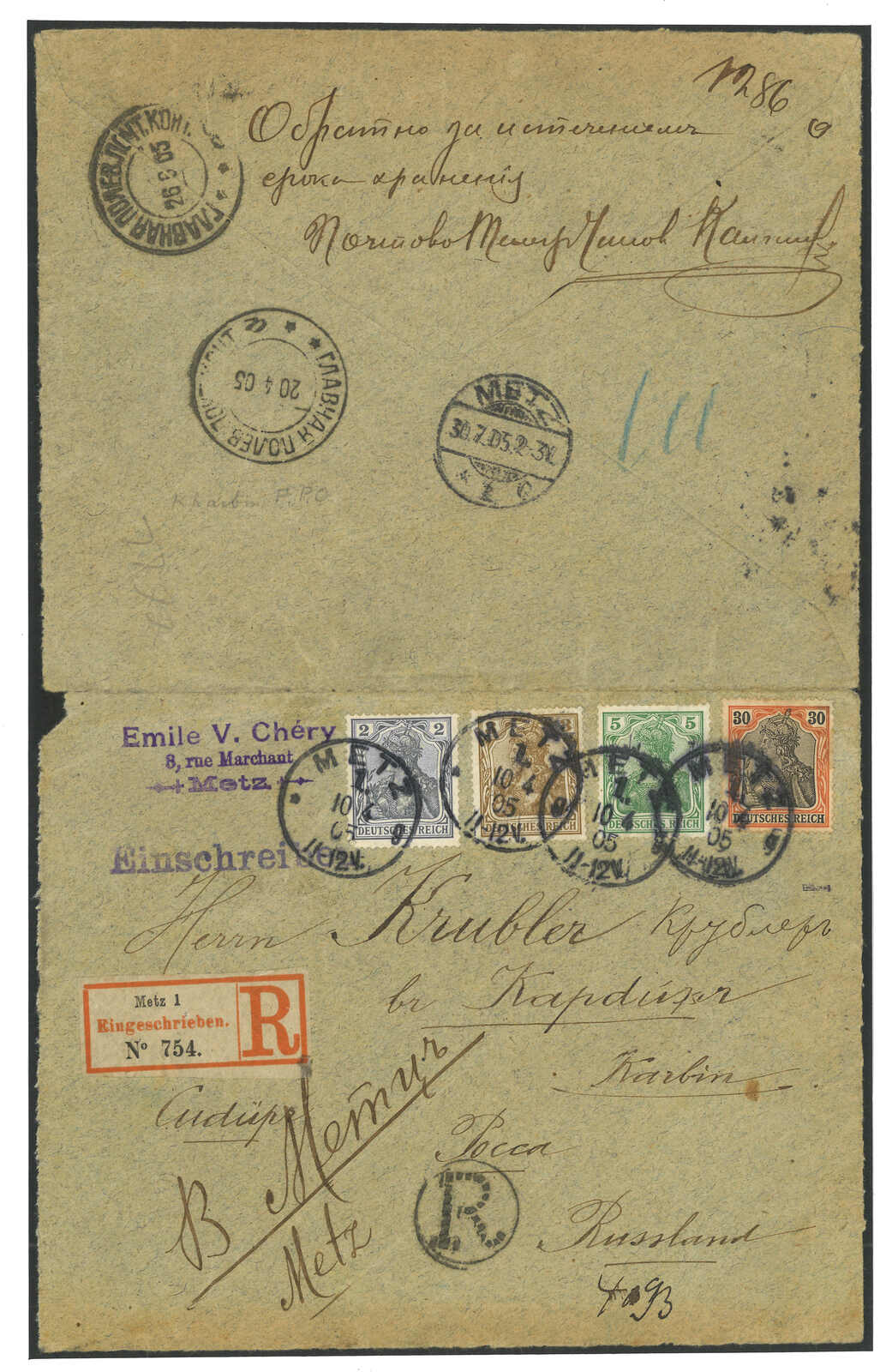 1905.4.10 德國寄哈爾濱,退回德國。掛號封,貼日耳曼尼亞像4枚,合40芬尼,銷Metz日戳,旁貼掛號標籤。 4.20抵哈爾濱野戰總局,6.20退回。7.30抵Metz。封剖開以作展示。(Image 1)