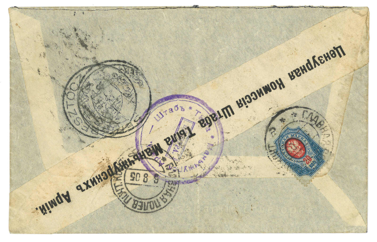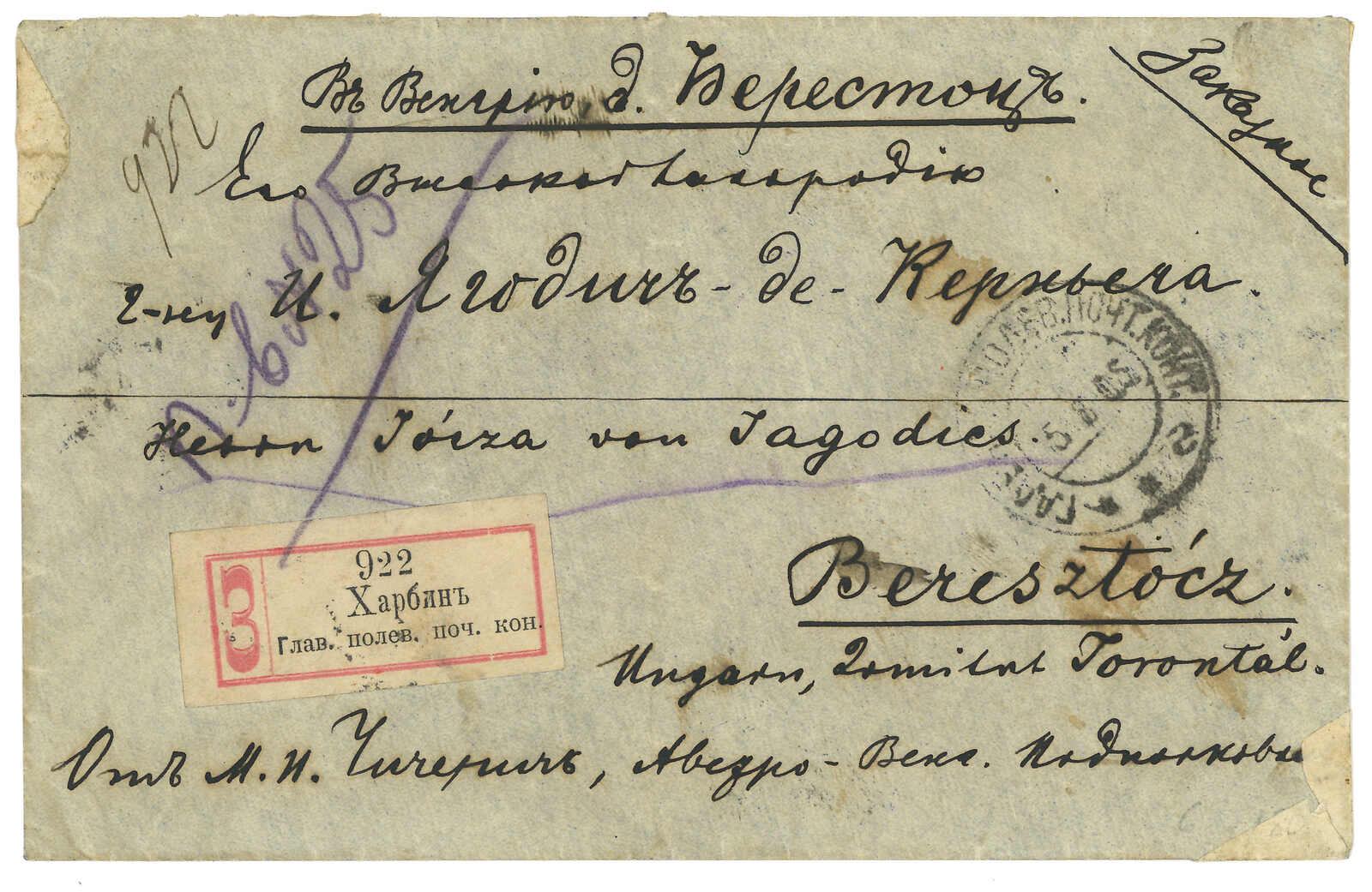 哈爾濱寄匈牙利。掛號封,背貼軍徽圖20戈比,銷哈爾濱野戰總局T&S 7型日戳。檢查並重封,鈐紫色檢查圓戳。抵Besztocz。(Image 1)