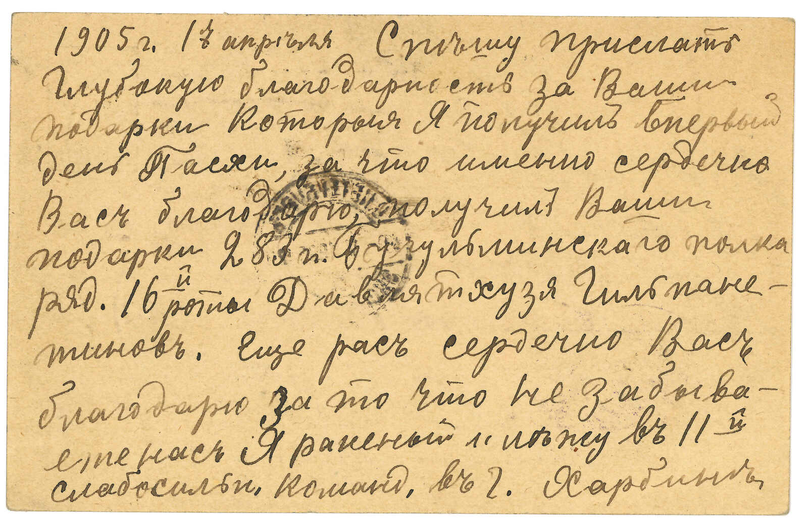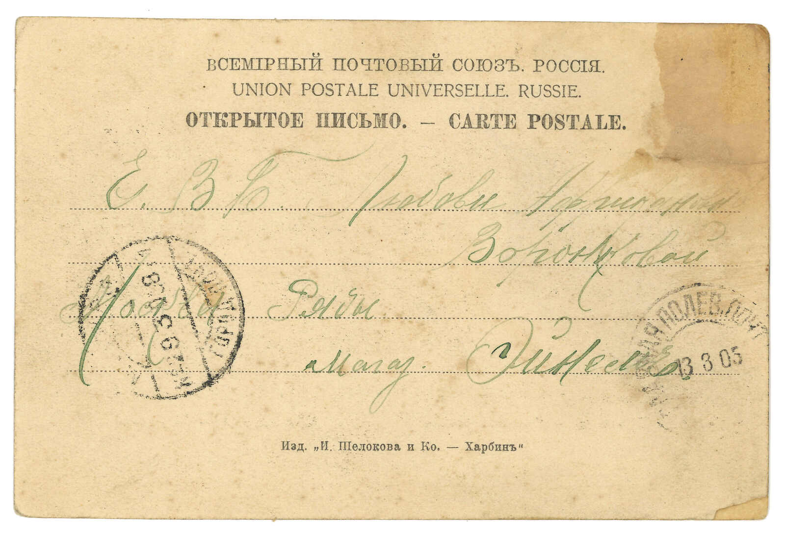 1905 Harbin (8 Feb) to warehouse of Empress Maria Feodorovna’s charity at the Anichkov Palace. St Petersburg. Russian postcard, frankless, applied with Harbin Field Post Office type 7B cds, alongside with 80th Siberian Military