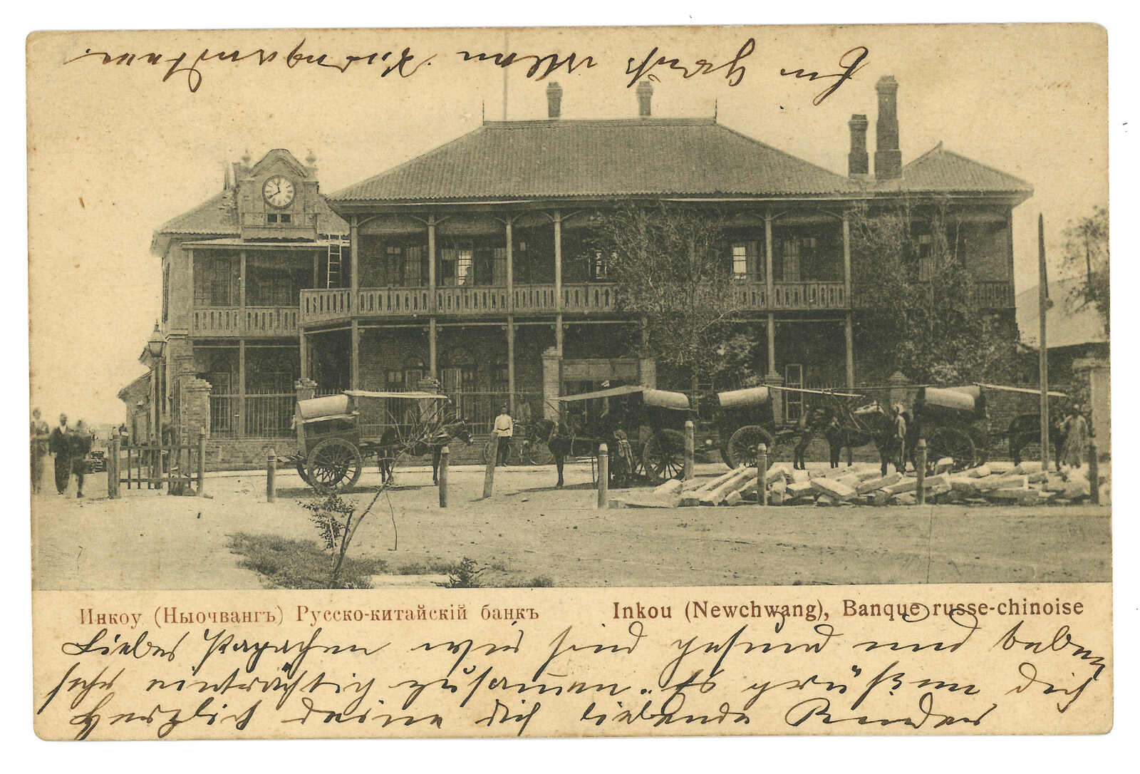營口華俄道勝銀行圖片明信片,自哈爾濱寄俄國,貼軍徽圖3戈比,銷哈爾濱野戰總局T&S 7型日戳。7.29抵俄國。(Image 1)