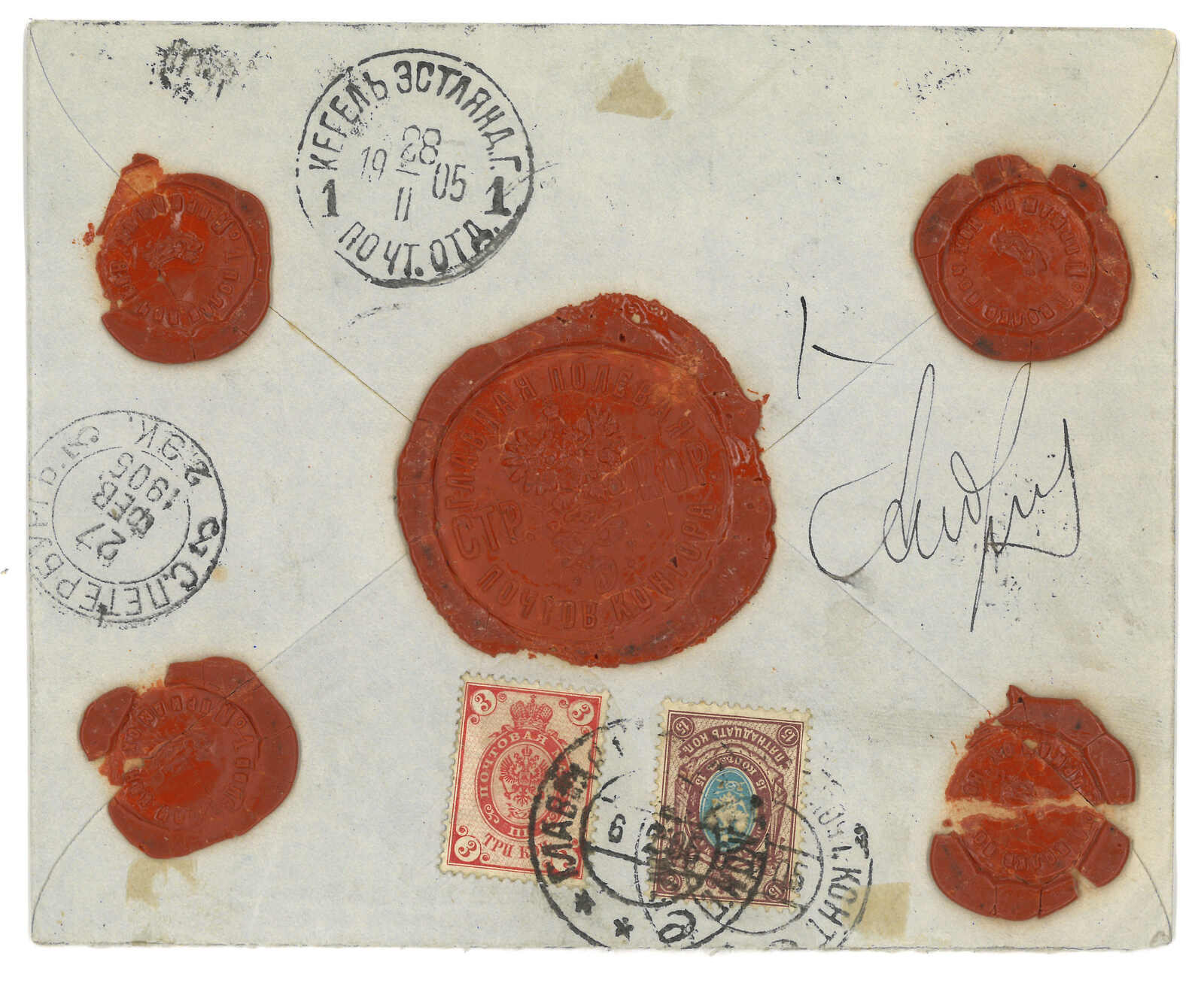 Head Field Post Office wax seal. Transit St Petersburg (27 Feb). Arrived Kegel (28 Feb).