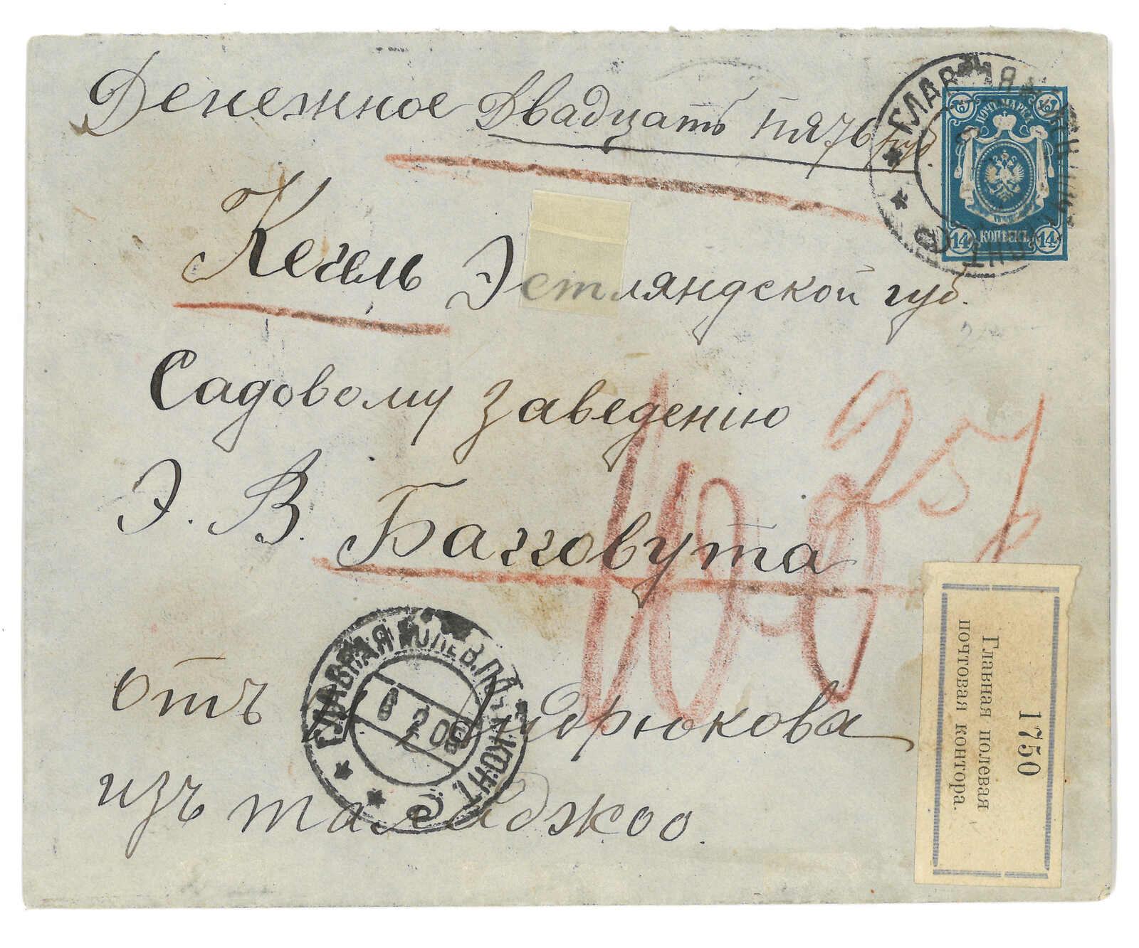 1905.2.6 俄國14戈比郵資封,自哈爾濱寄愛沙尼亞Kegel,加貼軍徽圖15戈比 + 3戈比,銷哈爾濱野戰總局T&S 7D型日戳。正貼掛號標籤,背鈐野戰總局火漆。2.27經聖彼得堡。2.28抵Kegel。(Image 1)