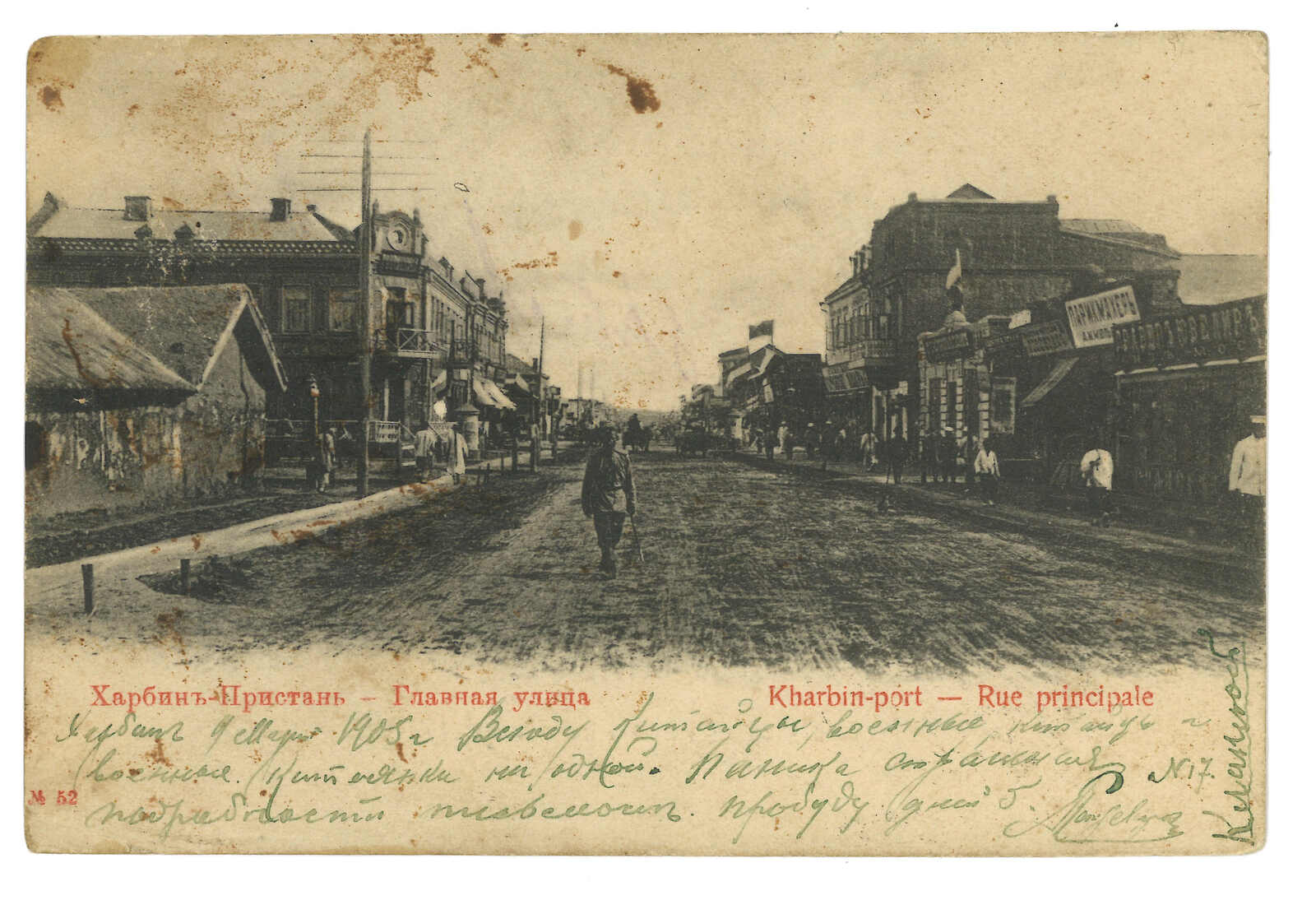 哈爾濱港口圖片明信片,寄自哈爾濱,掉票,鈐哈爾濱野戰總局T&S 7型日戳,旁鈐俄國到達戳。(Image 1)