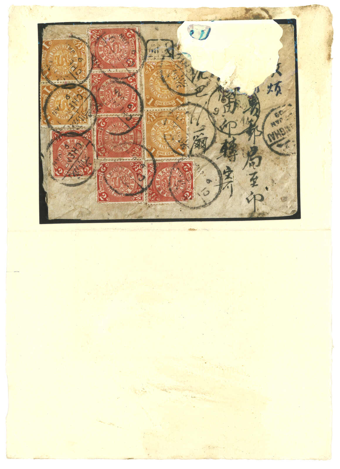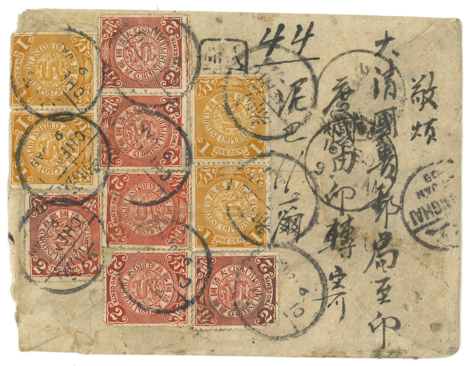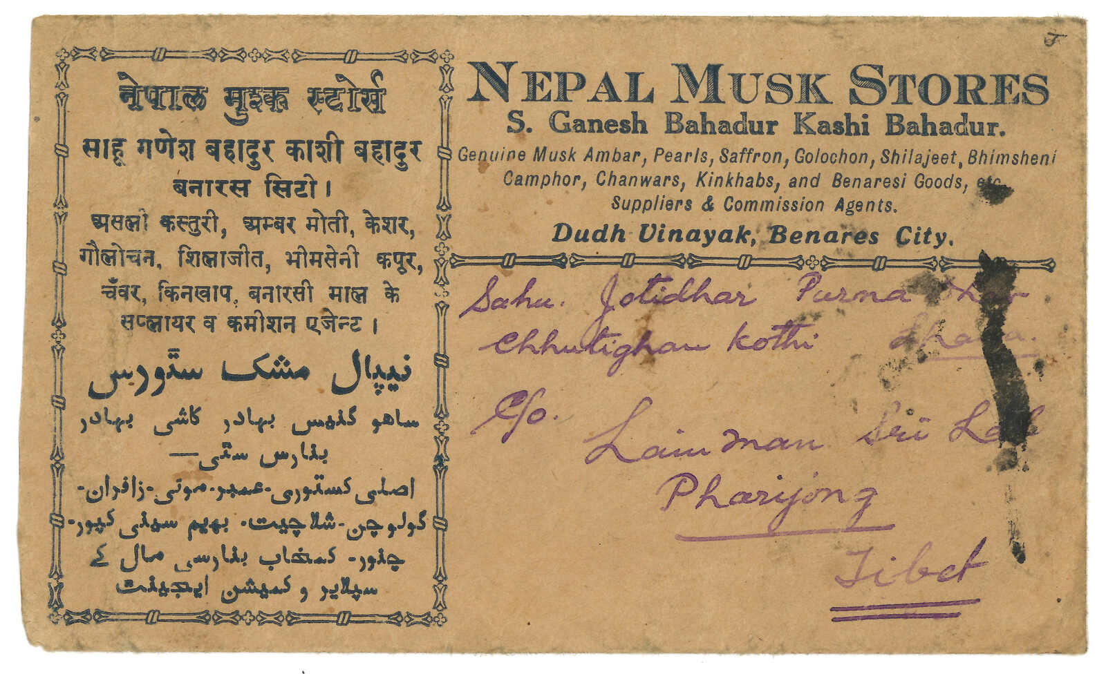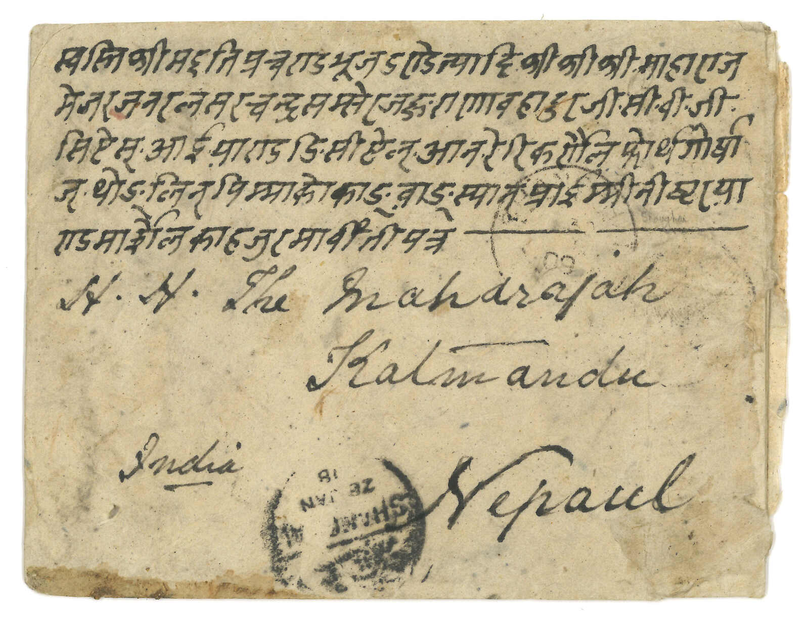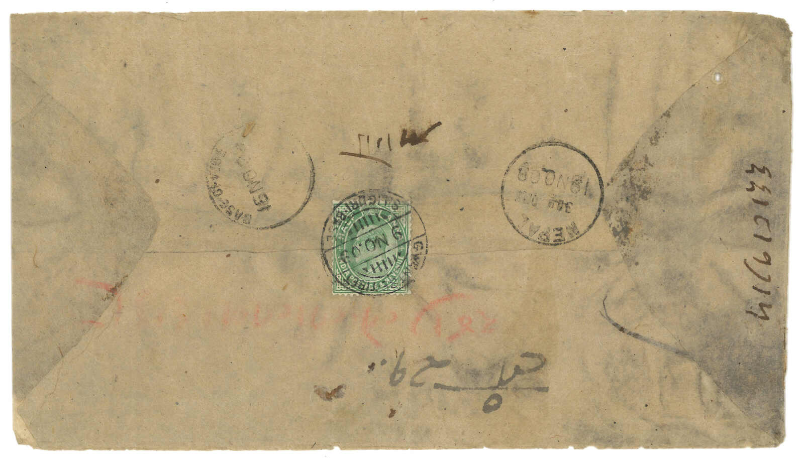1909.1.9成都寄往“泥巴爾”,由貢使寄給尼泊爾大君,1.28經上海,2.16經印度Tuticorin,2.21到達加德滿都。