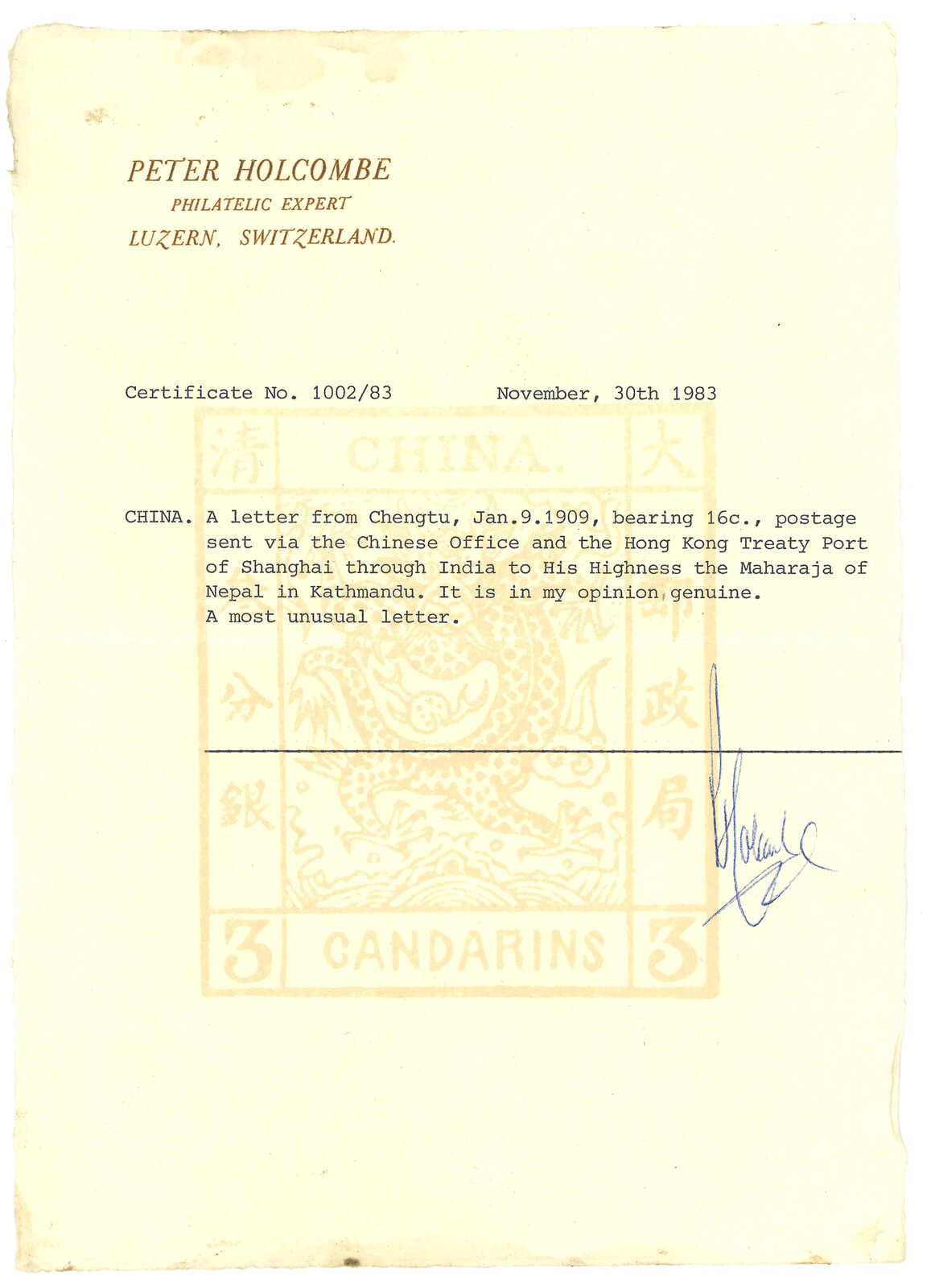 provisions from yizhan in China and Tibet, but mail route was not yet open, hence the detour of this letter by sea route. Holcombe Certificate 1983. Ex-Chazen.