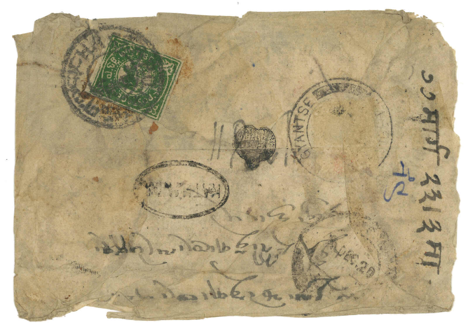 1909 (9 Nov) Letter from Gyantse to Commander-in-Chief Bhim Shumsher Jung Bahadur Rana, Kathmandu, applied with Gyantse BPO cds. Transit Base Office (16 Nov), Arrived Nepal (19 Nov).
