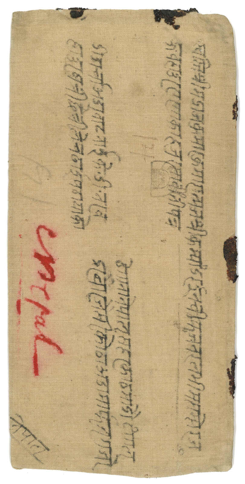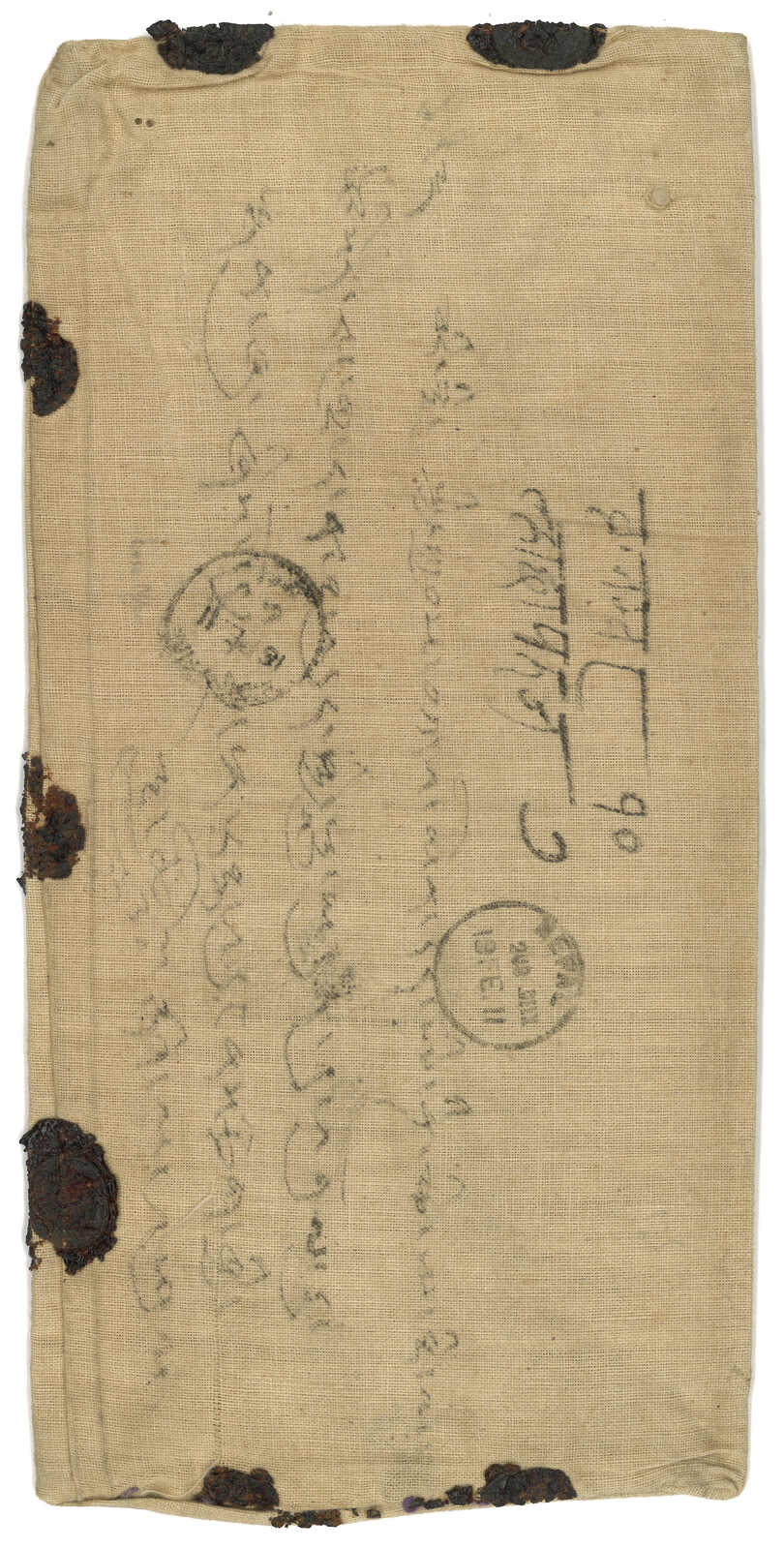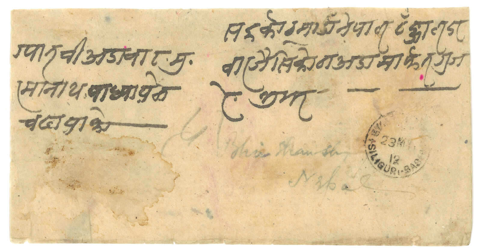 1911 (16 Feb) Linen bag from Nepali Resident, Shigatse to Nepal to the King of Nepal, stampless and carried by courier to Indian postal system. Spplied with Base Office cds. Arrived Nepal (19 Feb) with postage due 2a. No more