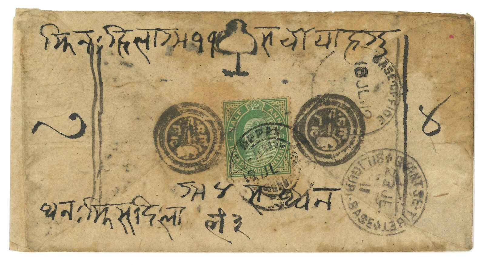1912.7.18 尼泊爾軍隊指揮官寄Kirmulung,寫有寄Kirmulung批示。貼印度愛德華七世半安娜,銷尼泊爾日戳。