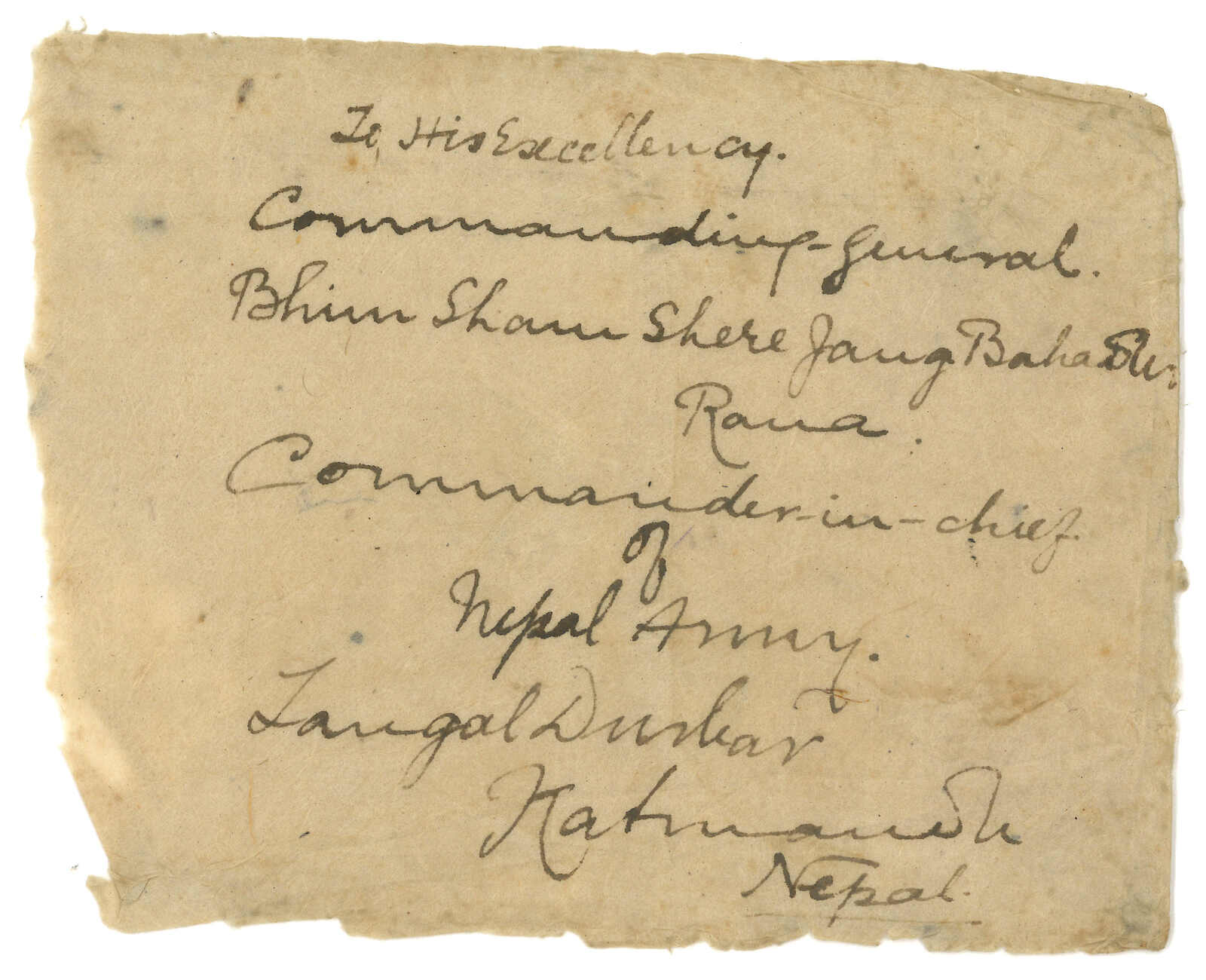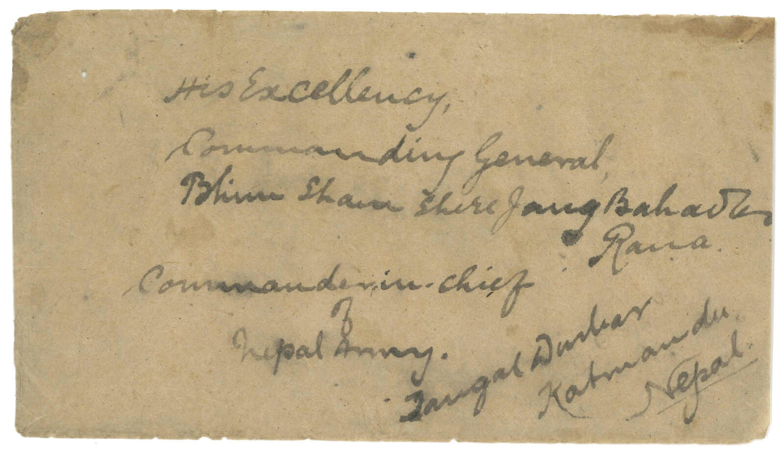 1910 Cover to Commander in Chief Bhim Shan Shere Jang Bahadur Rana, Kathmandu, applied with Base Office (14 Oct) origin cds. Arrived Nepal (18 Oct). This letter was sent unusually through Base Office which means the sender was