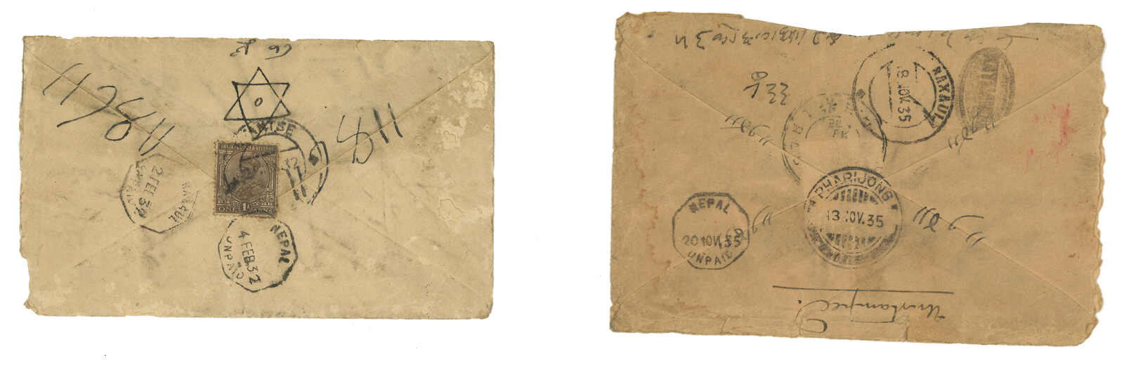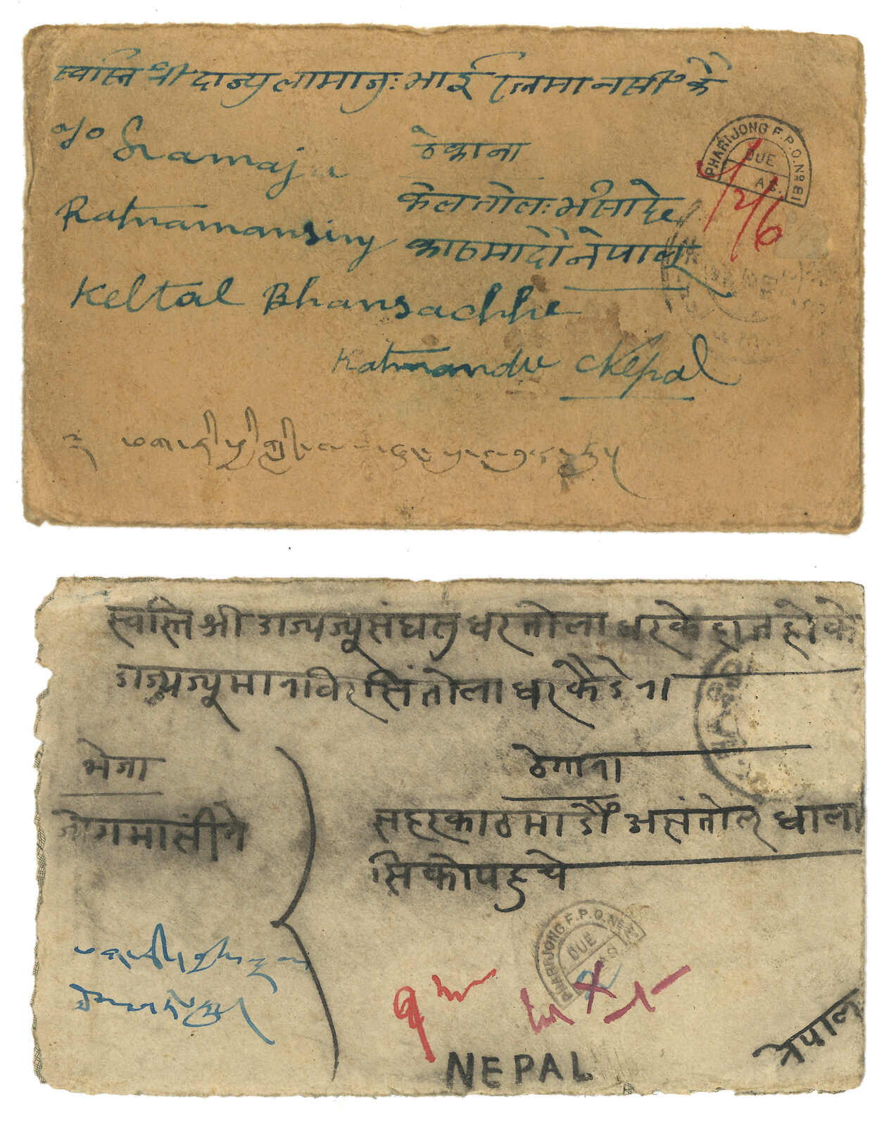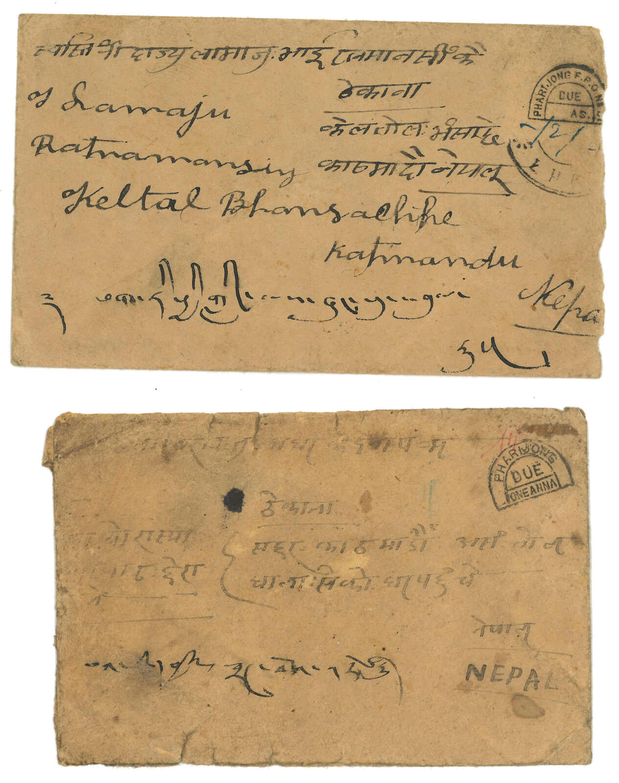 1920-1930s a pair of taxed covers to Nepal via Pharijong. One f.w. Indian KGV 1/2a. Another one stampless., both applied with FPO No. 81 due mark.