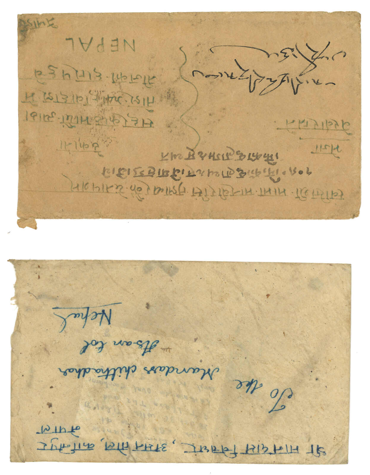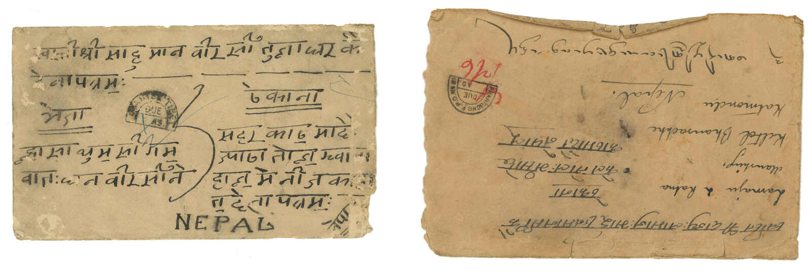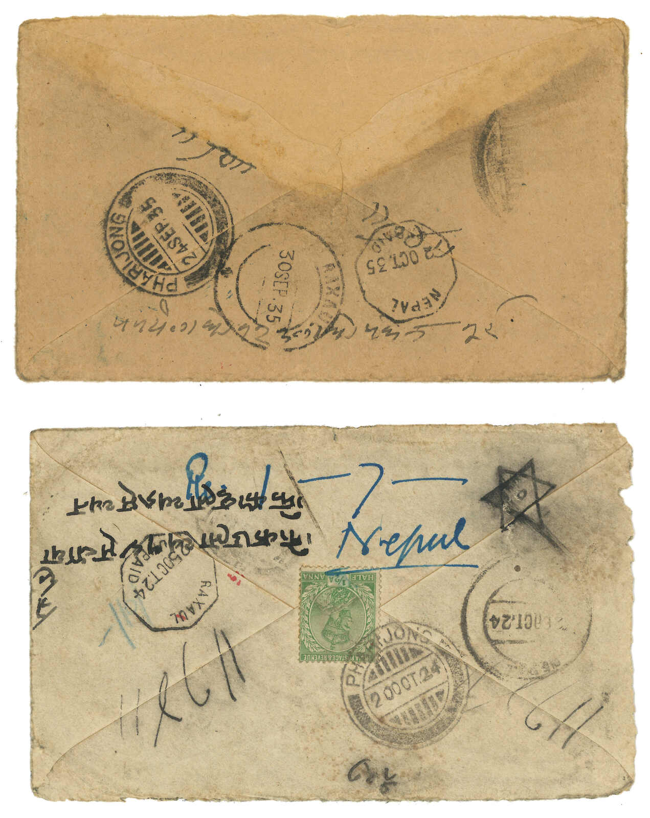 1920-1930s a pair of taxed covers to Nepal via Pharijong. One f.w. Indian KGV 1/2a. Another one stampless., both applied with FPO No. 81 due mark.