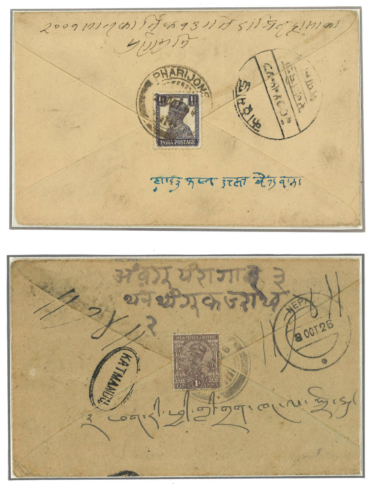 1926 and 1944 a pair of covers from Pharijong to Kathmandu, f.w. Indian KGV 1a and KGVI 1/2a respectively, tied by Pharijong BPO cds. Showing different types of Nepal / Kathmandu arrival cds.