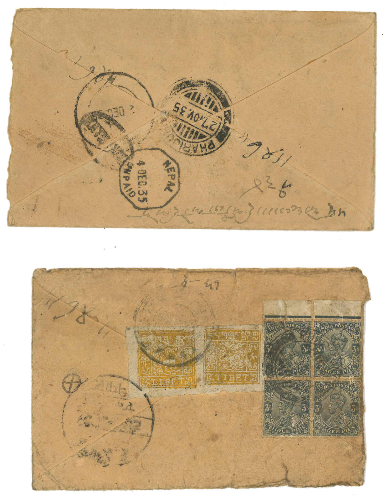 1930s a pair of taxed covers to Nepal via Pharijong. One f.w. Tibet 3rd issue 1/2tr in pair in combination with Indian KGV 3p in block of 4. Another one stampless. Showcasing different types of Pharijong BPO due marks.