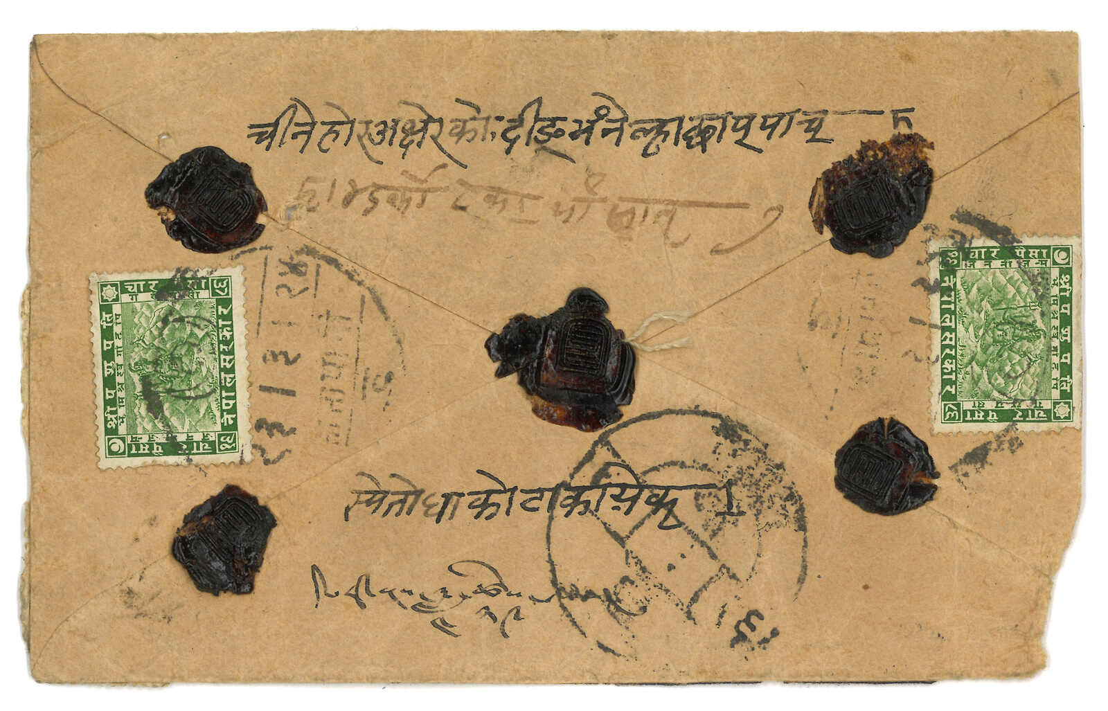 1933 Tingari to Kathmandu, f.w. Nepalese Siva Mehadeva 4p x7 for multiple weight registered rate, tied by Tatapani cds. Showing Tingari and Tatapani manuscript. Arrived Kathmandu.