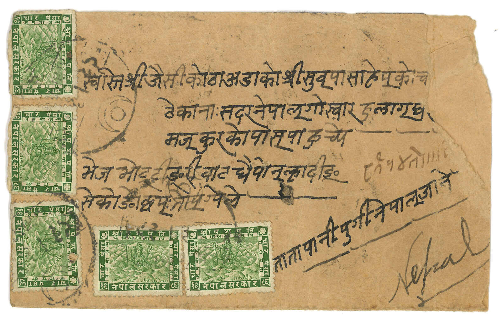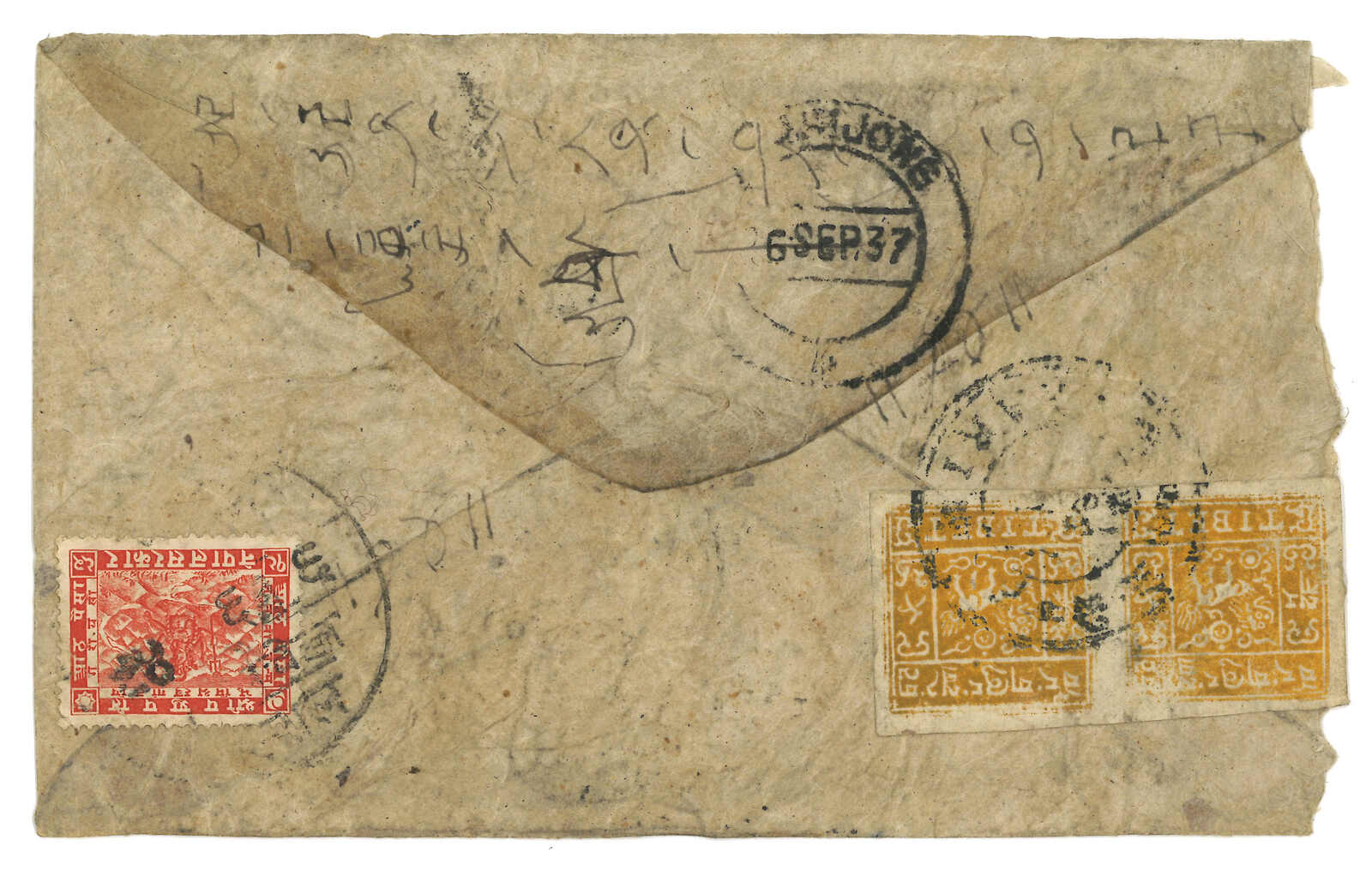 1937 Nepal to Pharijong, f.w. Nepalese Siva Mehadeva 4p. Transit Gyantse BPO (6 Sep). In combination with Tibet 3rd issue 1/2tr in pair, tied by Phari h.s.