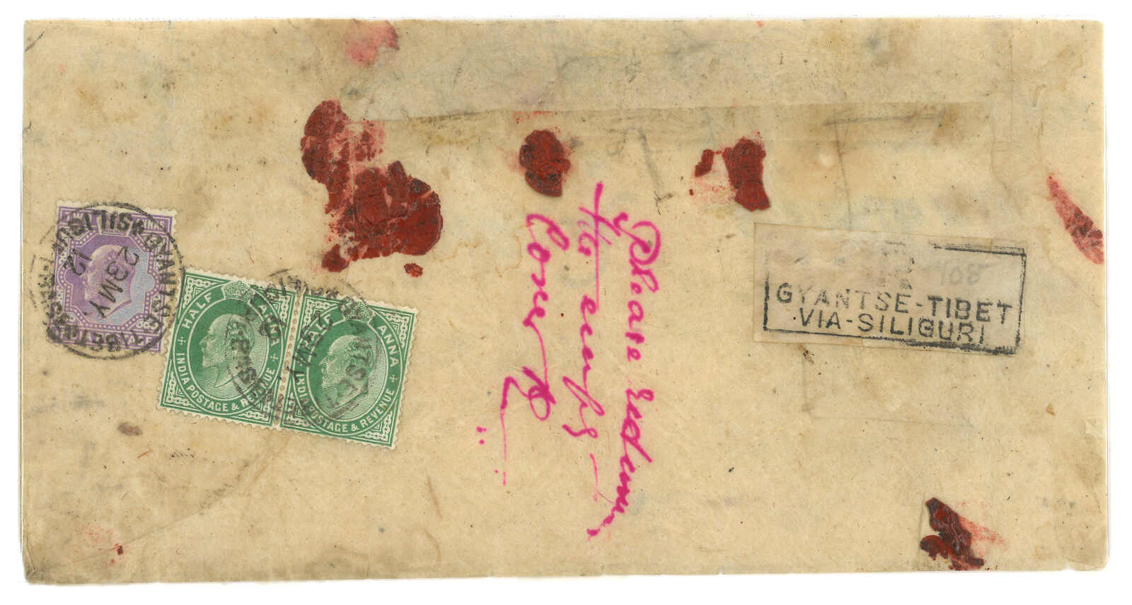 1912.5.23 江孜寄尼泊爾,背貼印度愛德華七世半安娜雙連 + 2安娜,銷江孜英局日戳,旁貼GA型掛號標籤。(Image 1)
