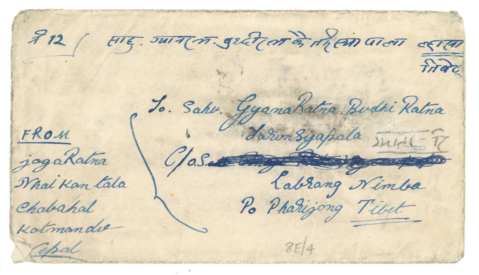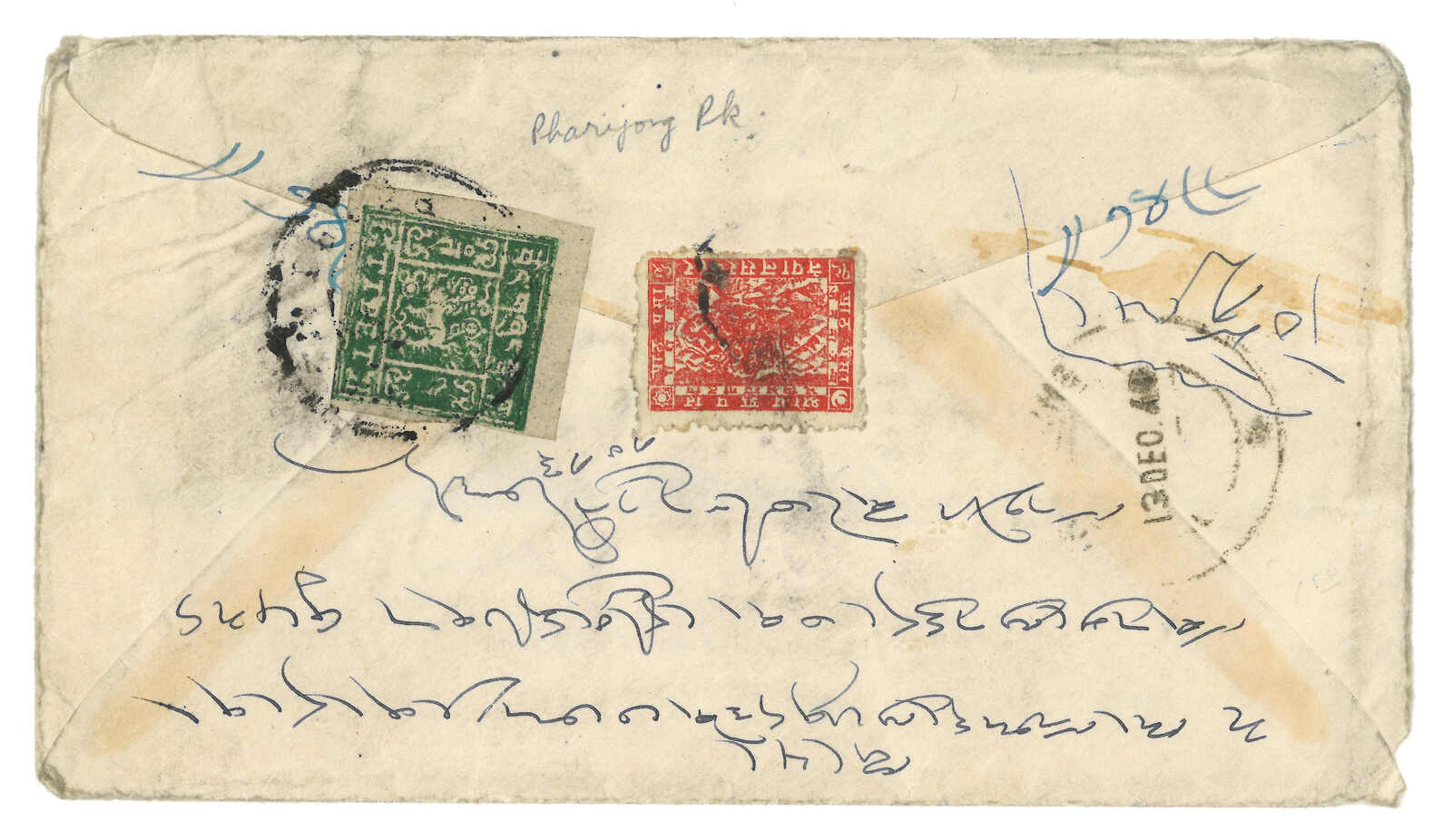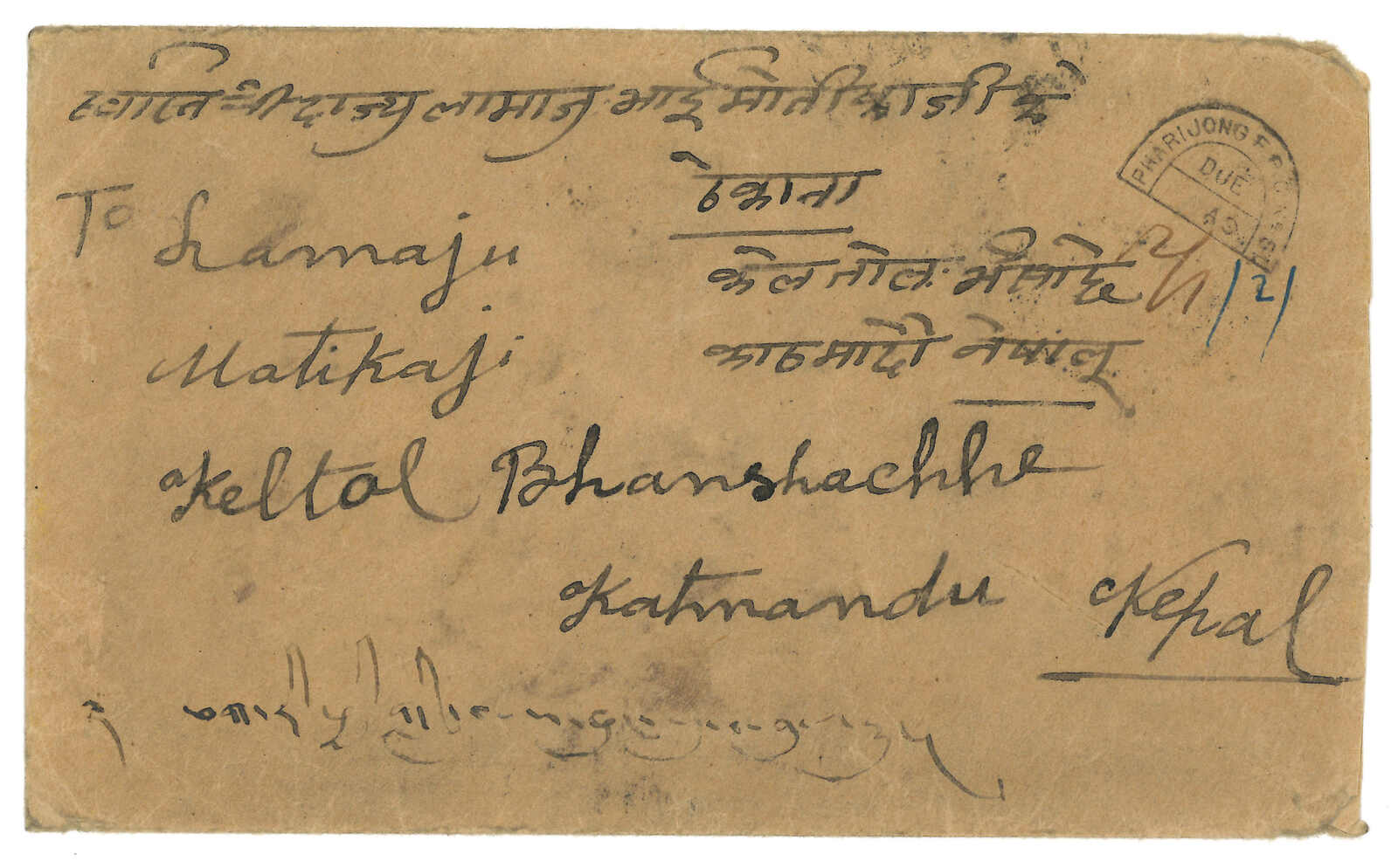 1940 Kathmandu to Pharijong, f.w. Nepalese Siva Mehadeva 8p on reverse. Transit Pharijong BPO (13 Dec). In combination with Tibet 3rd issue 4tr. Nice incoming combination example from Nepal.