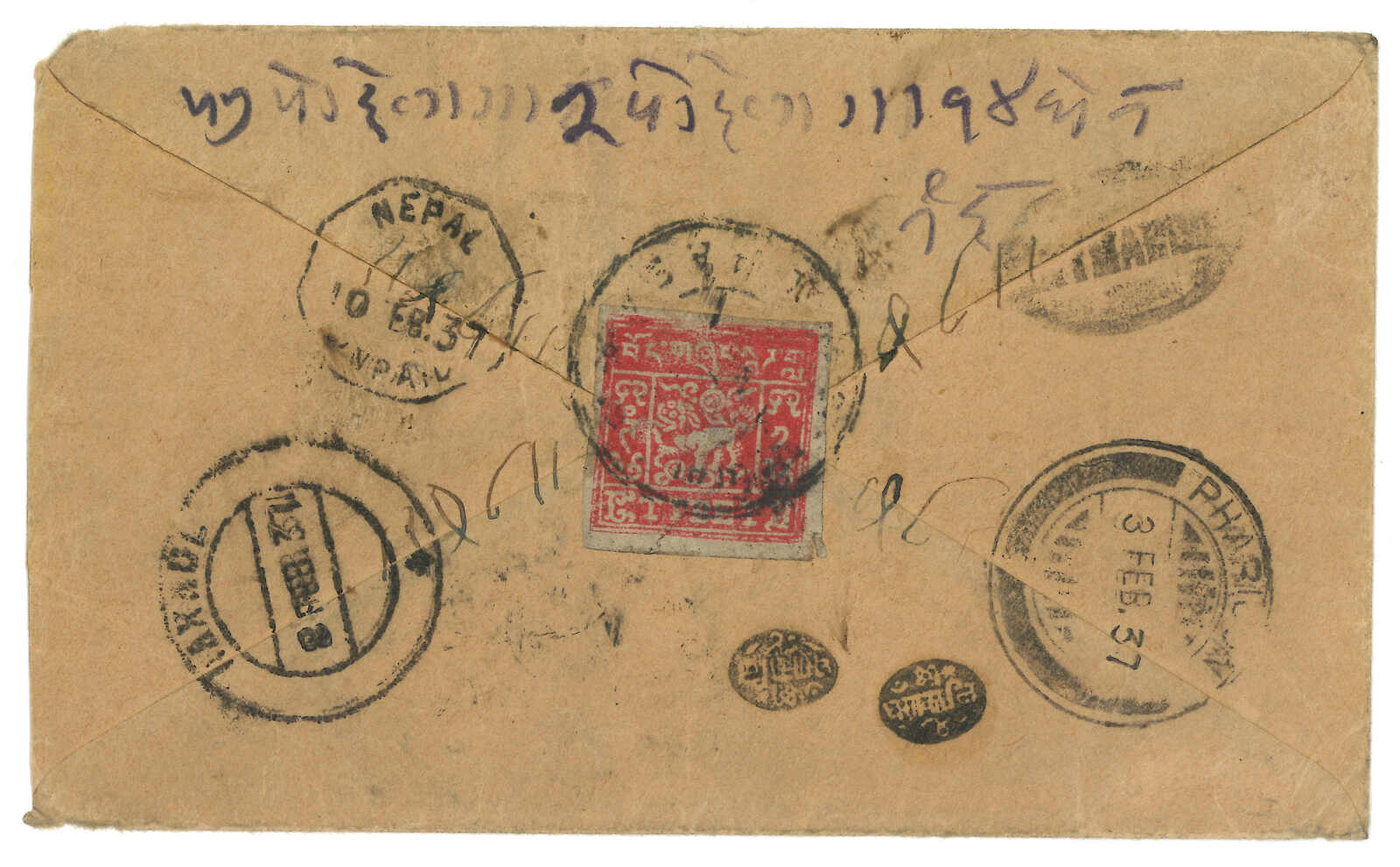1937 Lhasa to Kathmandu, f.w. Tibet 3rd issue 1tr, tied by Lhasa h.s. Transit Pharijong BPO (3 Feb) with due mark. Further transit Raxaul (8 Feb). Arrived Nepal (10 Feb). Showing two oval black seals. Interesting.
