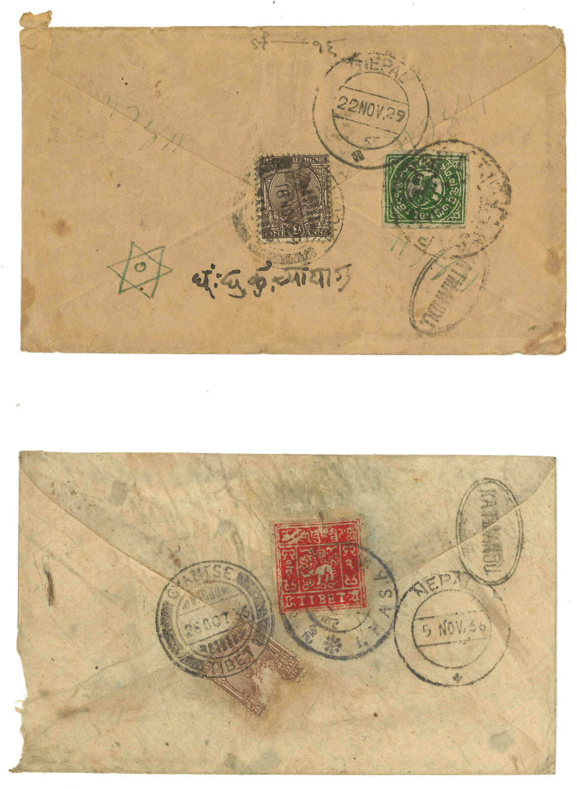 1929 and 1936 a pair of covers from Lhasa to Nepal, f.w. Tibet 1st issue 1/6tr and 3rd issue 2tr respectively. In combination with Indian issues, tied by Gyantse BPO cds. Arrived Nepal with oval KATHMANDU cachet.