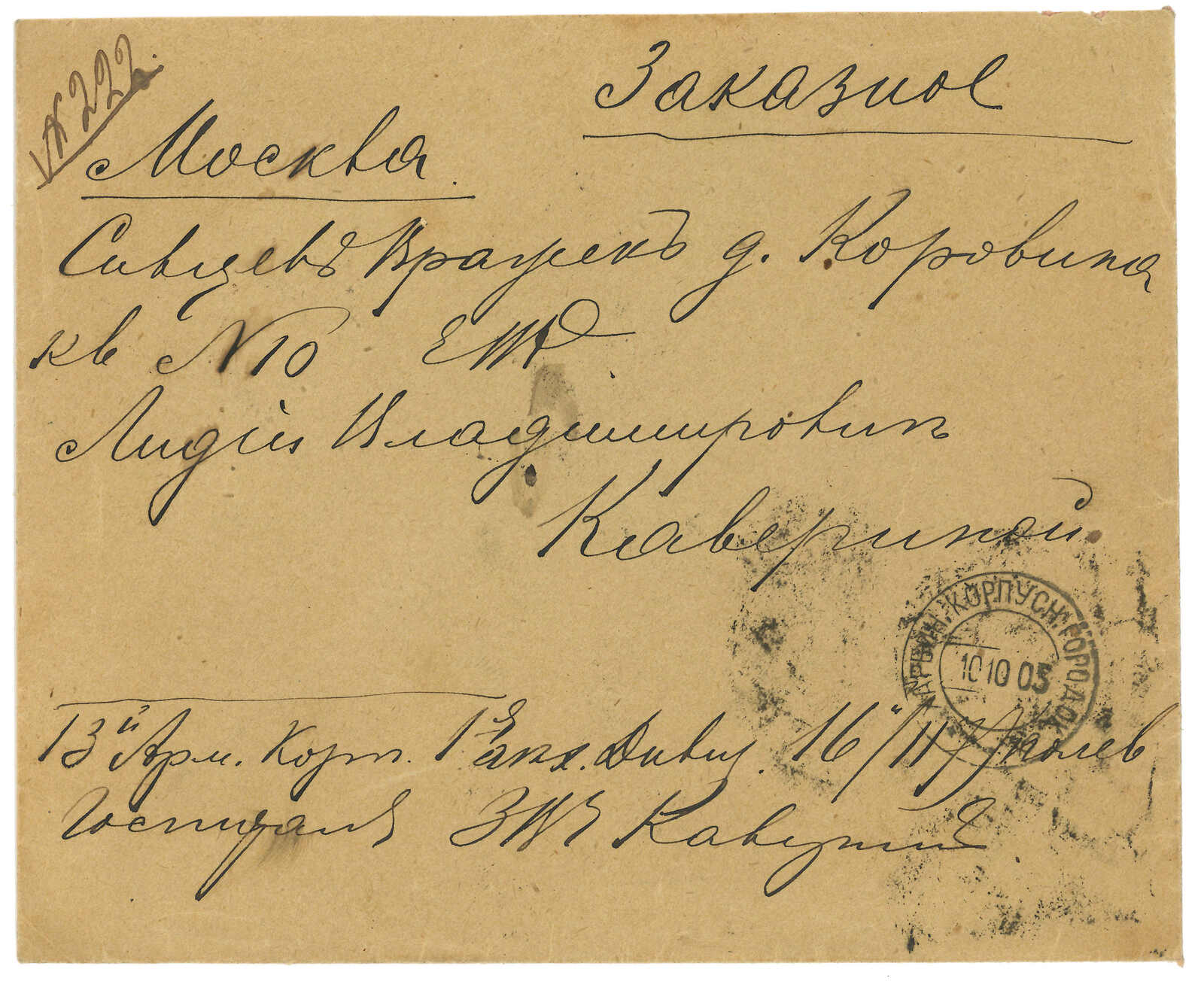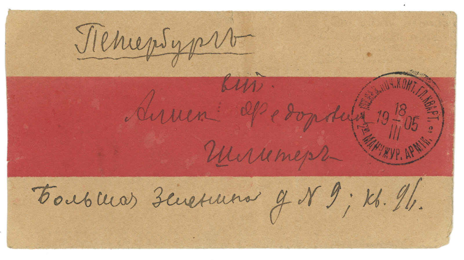 1905 (18 Mar) red band cover from Manchurian Army to St. Petersburg, frankless, applied with Manchurian Army Field PO No. 2 cds.