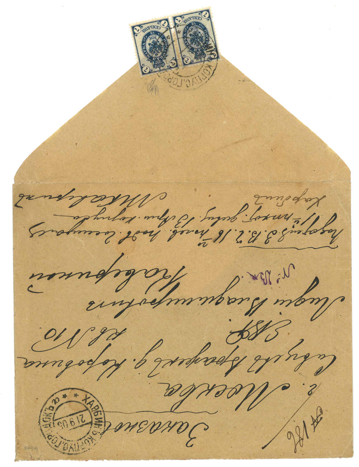 1905 Harbin (10 Oct) to Russia, f.w. Coat of Arms 7k in pair on reverse, tied by T&S unrecorded small size Harbin Camp cds, alongside with Harbin Camp T&S type 1 cds in normal size. Arrived Moscow (Nov). With Peter
