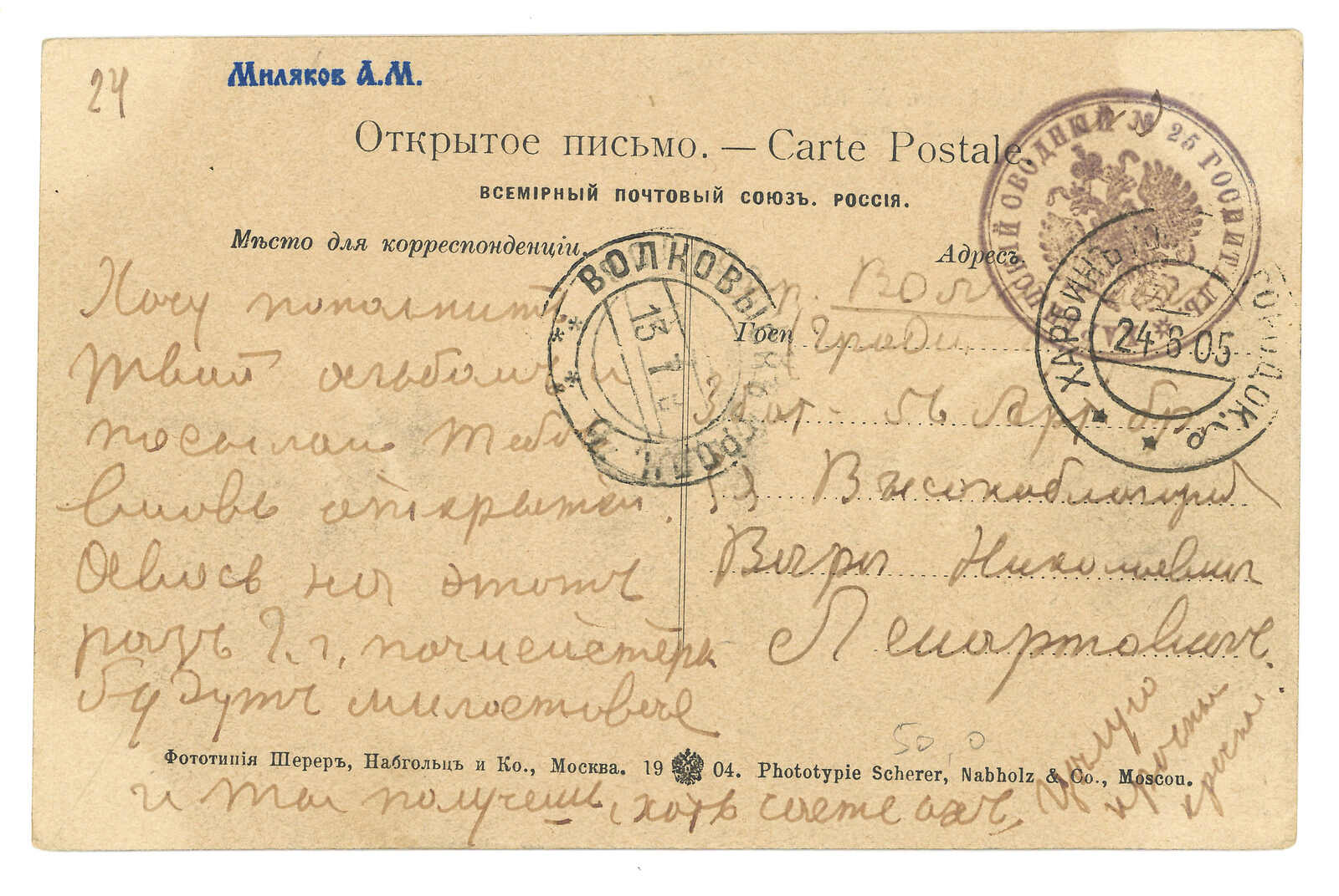 1905.10.13 俄國明信片,無貼票,鈐哈爾濱醫院b字日戳,旁鈐紫色圓戳。11.7抵聖彼得堡。(Image 1)