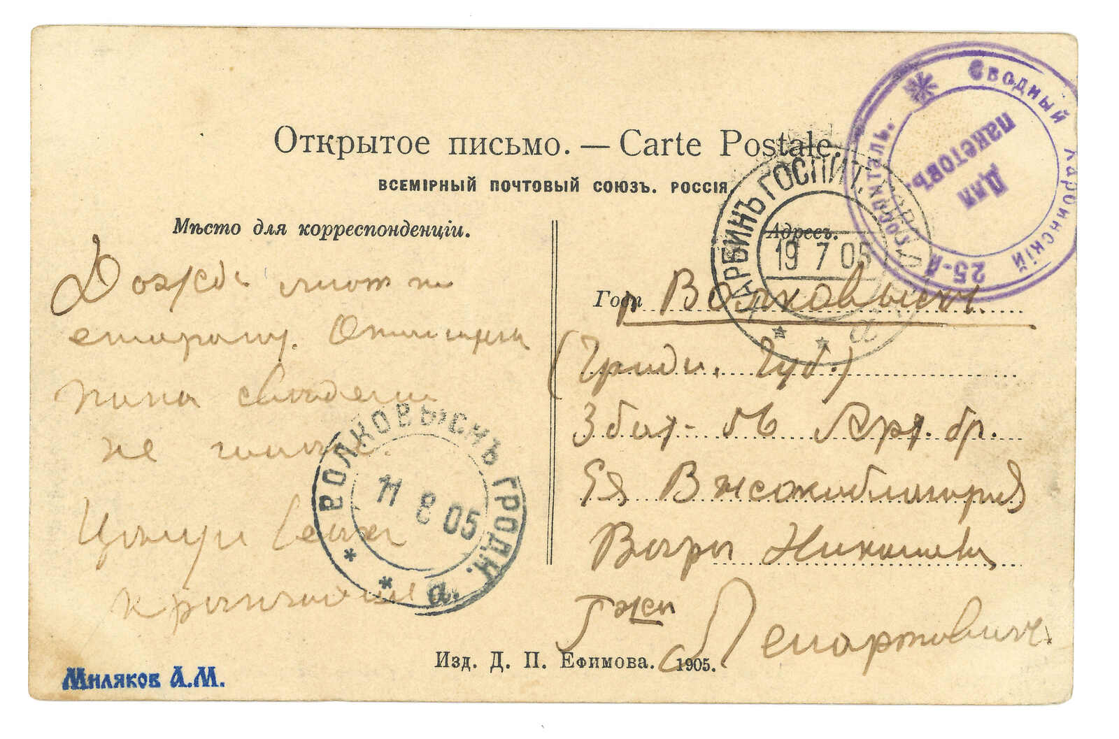 1905 (19 Jul) Picture postcard, frankless, applied with Harbin Hospital quarter index a cds, alongside with 25th Harbin General Hospital circular seal in violet. Arrived Russia (11 Aug).