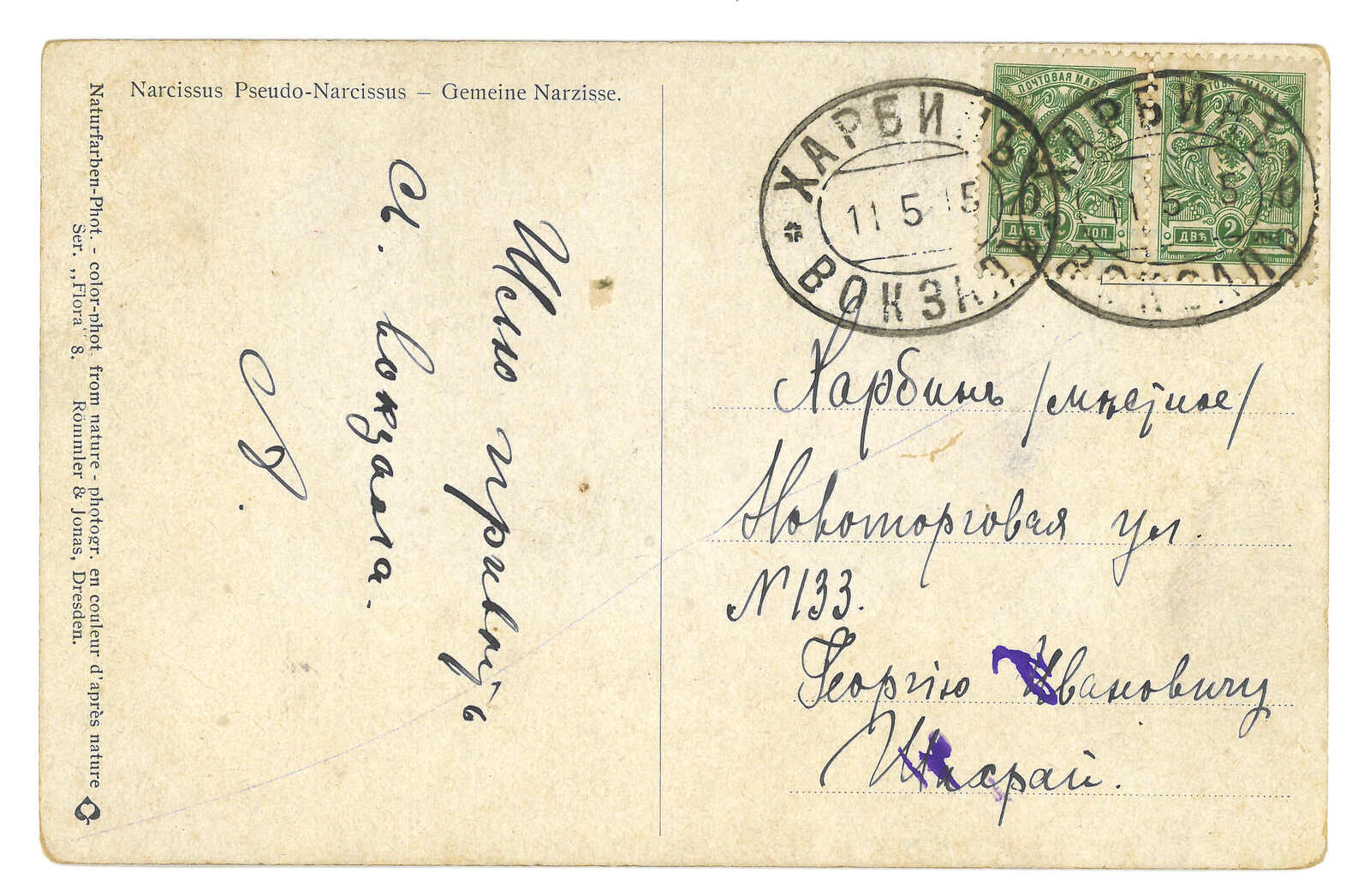 1915.5.11 哈爾濱本埠。圖片明信片,貼軍徽圖2戈比雙連,銷哈爾濱中央車站2型橢圓形日戳。(Image 1)