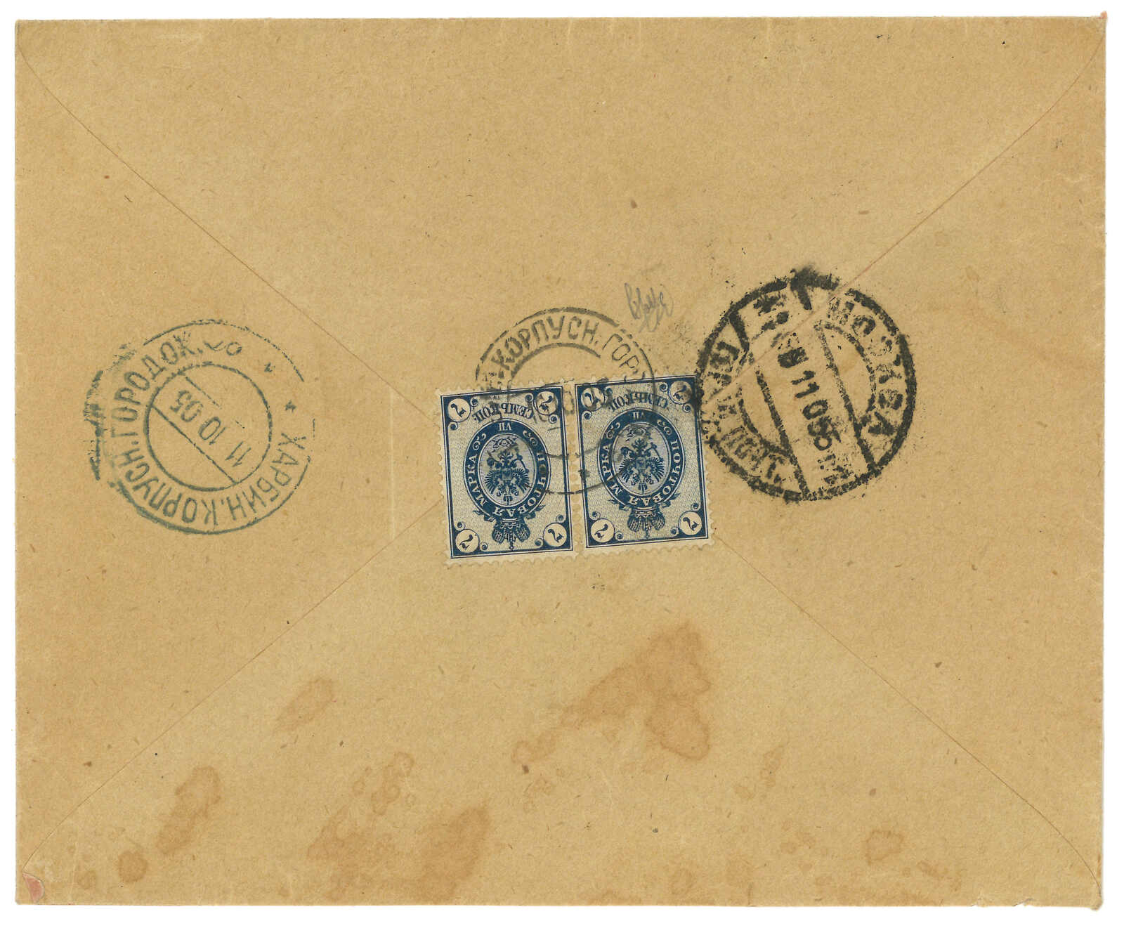 1905.9.21 哈爾濱兵營寄莫斯科,背貼軍徽圖7戈比雙連,銷哈爾濱營T&S 1a型日戳。10.17抵莫斯科(Image 1)