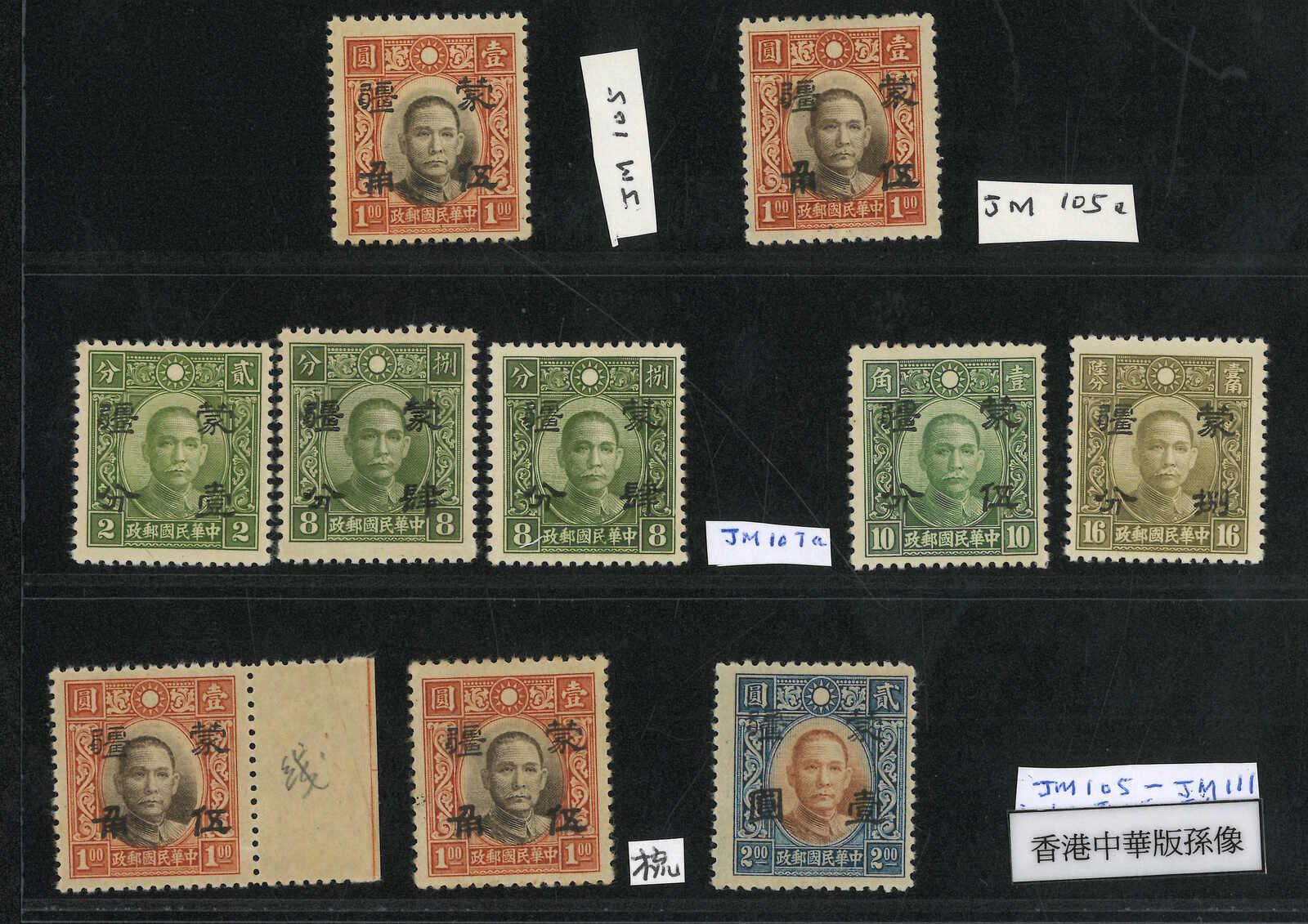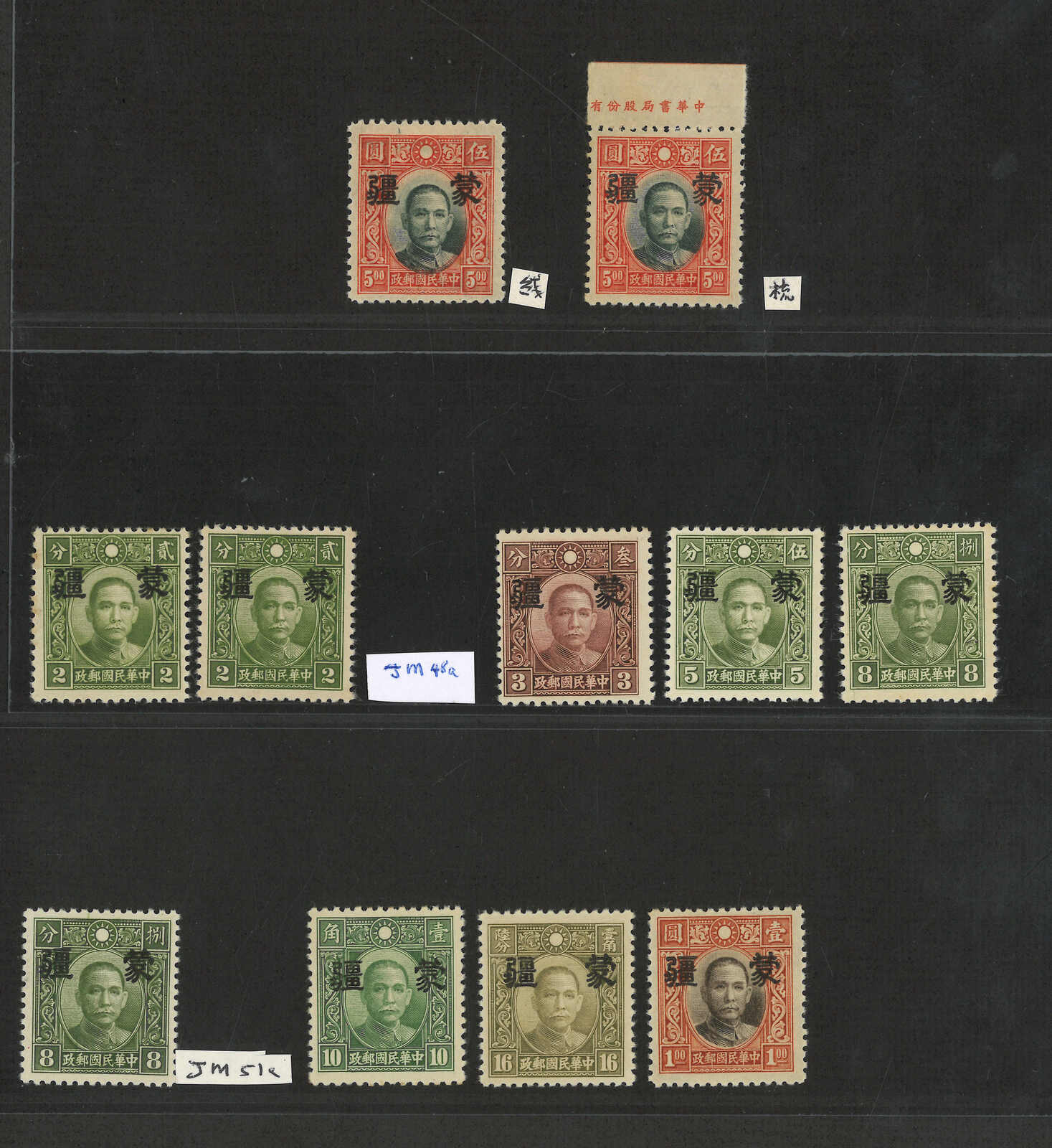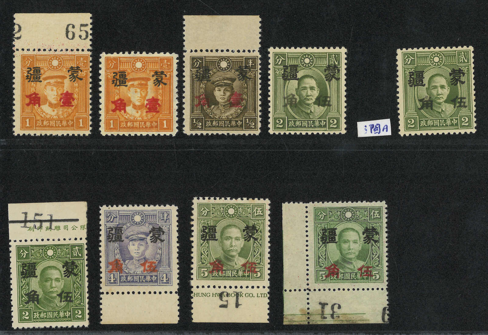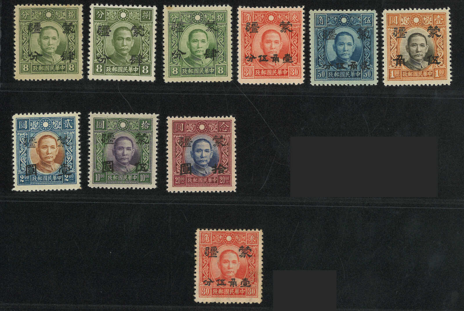 1941年中華版孫像加蓋大字“蒙疆”新全(陳目JM48-55),當中2分、8分及1角包含改版票或不同齒孔。無貼或背貼上品。(Image 1)