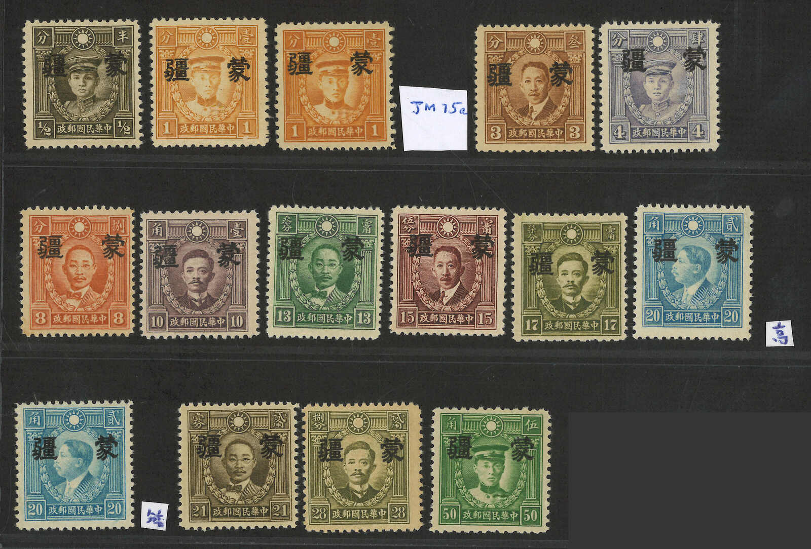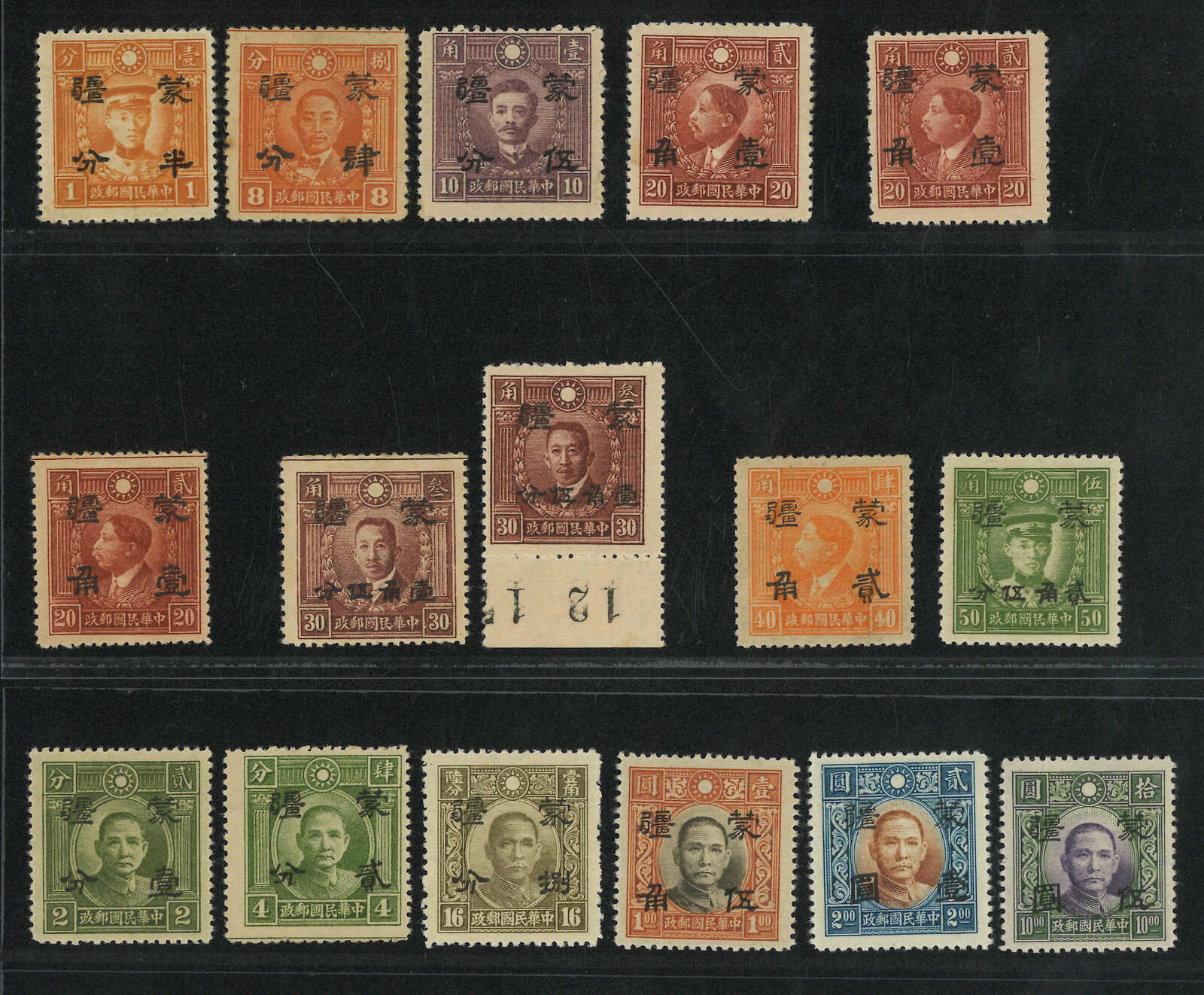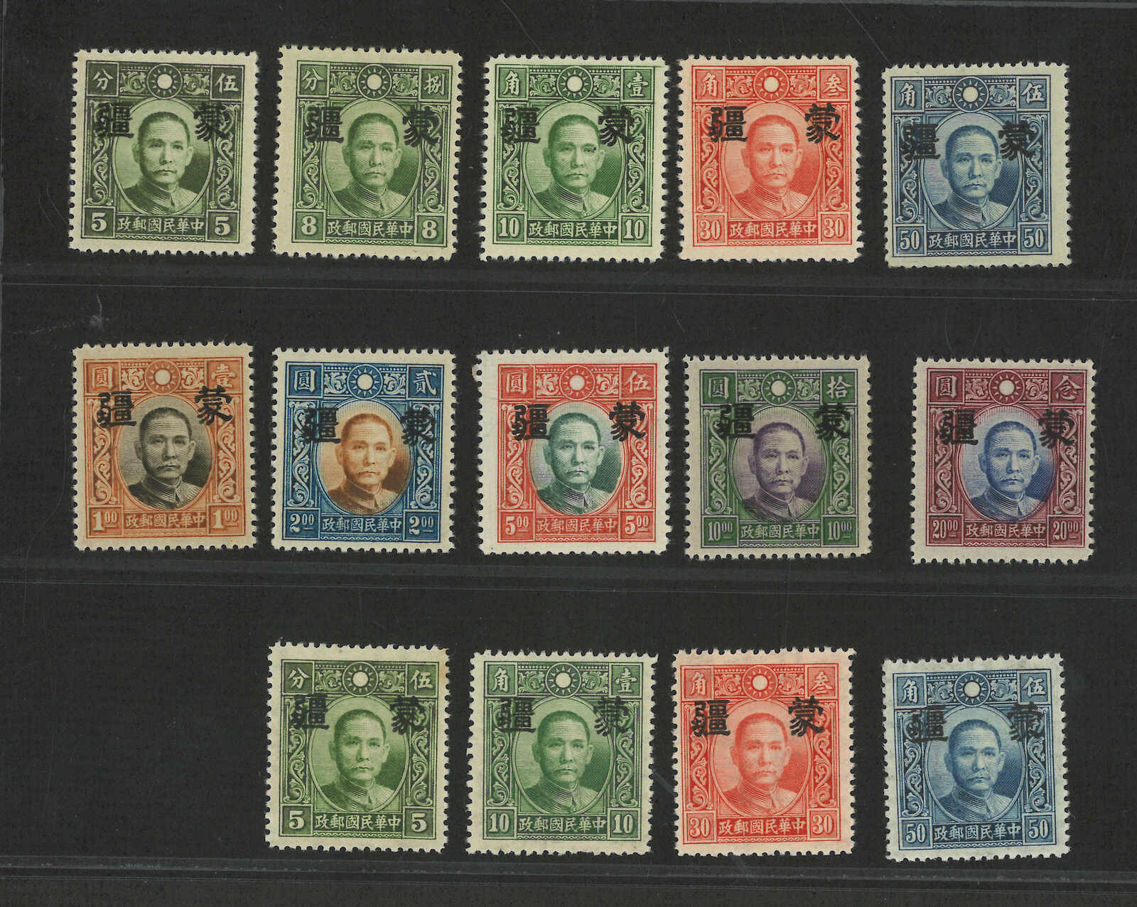 1941年大東版孫像加蓋大字“蒙疆”新全,包含無水印及有水印票(陳目JM56-69),無貼/輕貼上品。(Image 1)