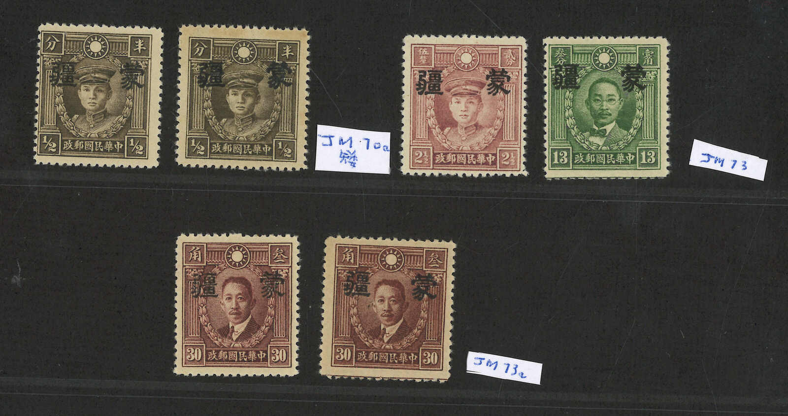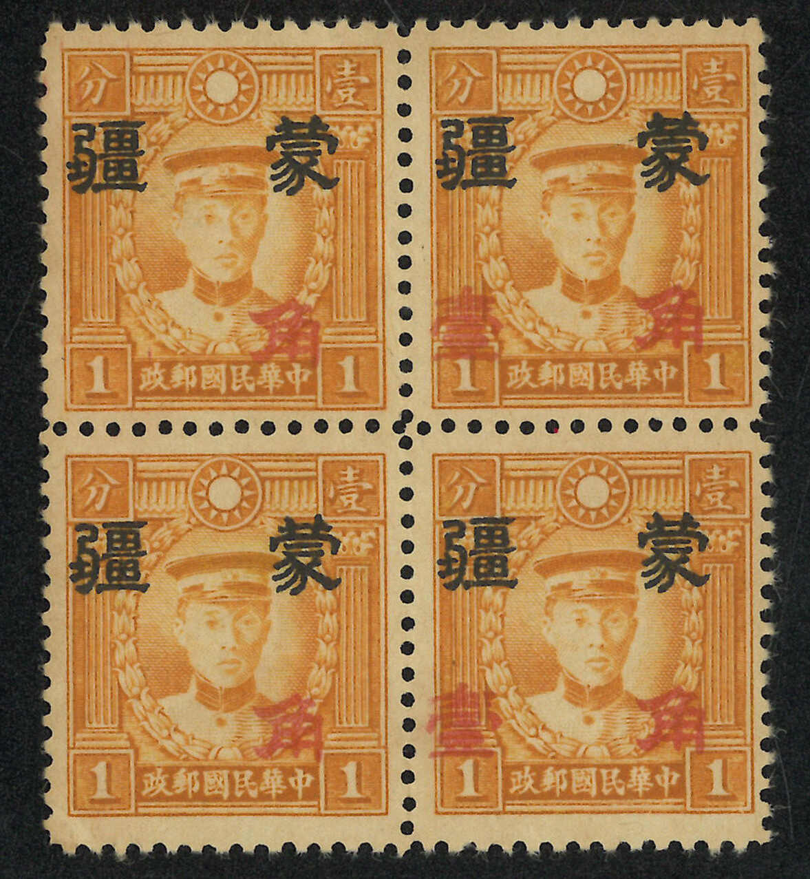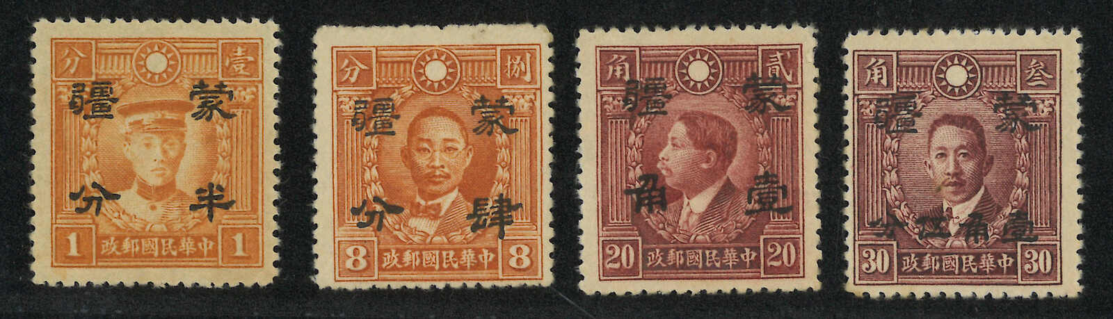 1941年北京版烈士加蓋大字“蒙疆”新全,當中半分及3角附有矮票(陳目JM70-73),無貼/輕貼上品。(Image 1)