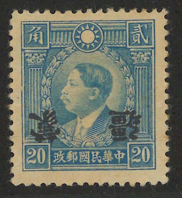 1941 Hong Kong Print unwmk Martyrs 20c ovpt. large figure “Mengkiang”, with inverted overprint variety (Chan JM83). MNH. Very Fine.