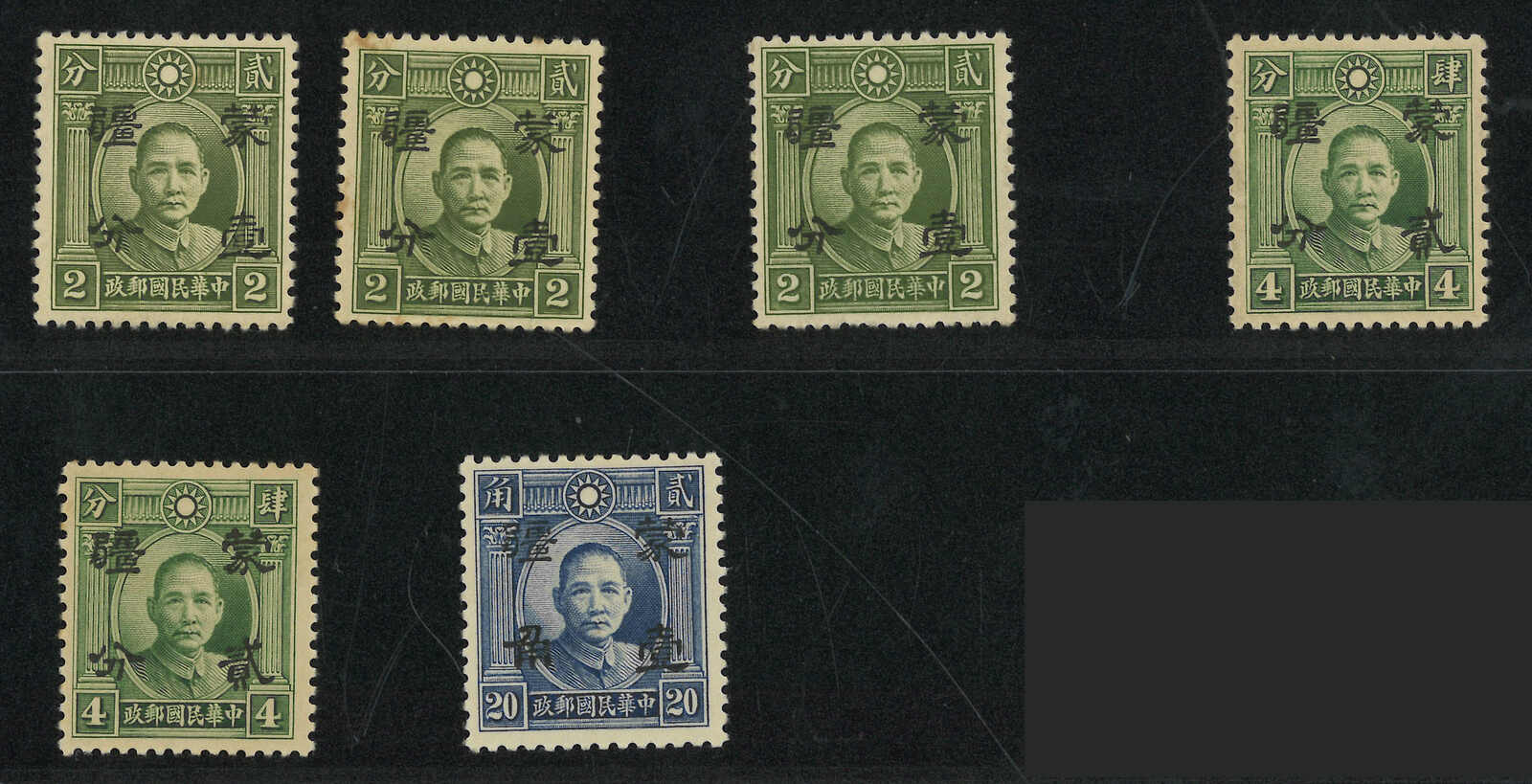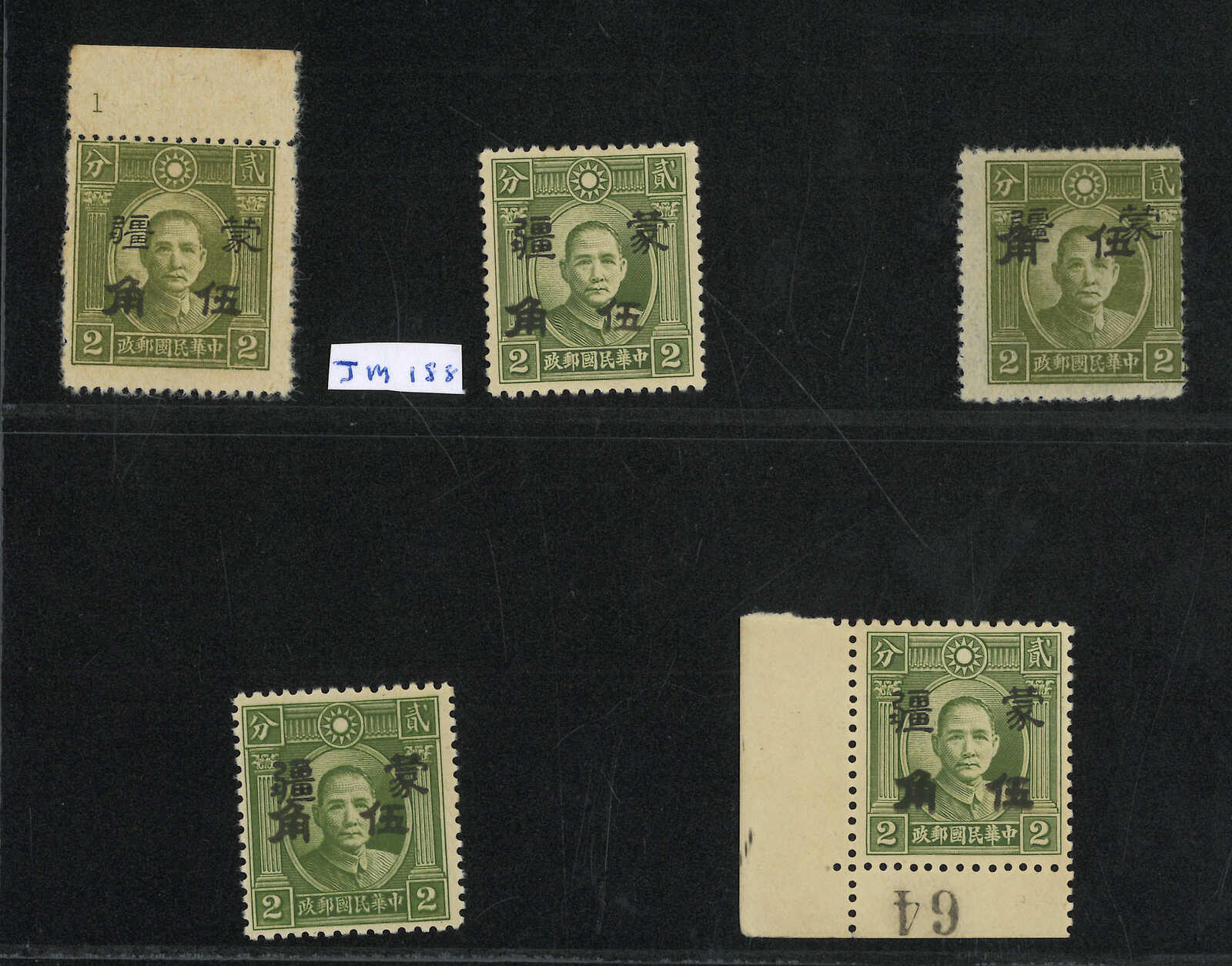 1945年倫敦版及仿版孫像2分加蓋小字“蒙疆”再改值伍角正常票及變異票一組五枚(陳目JM188),展示了改值移位及複蓋變異等。陳目未有記錄此加蓋於仿版孫像原票上。(Image 1)