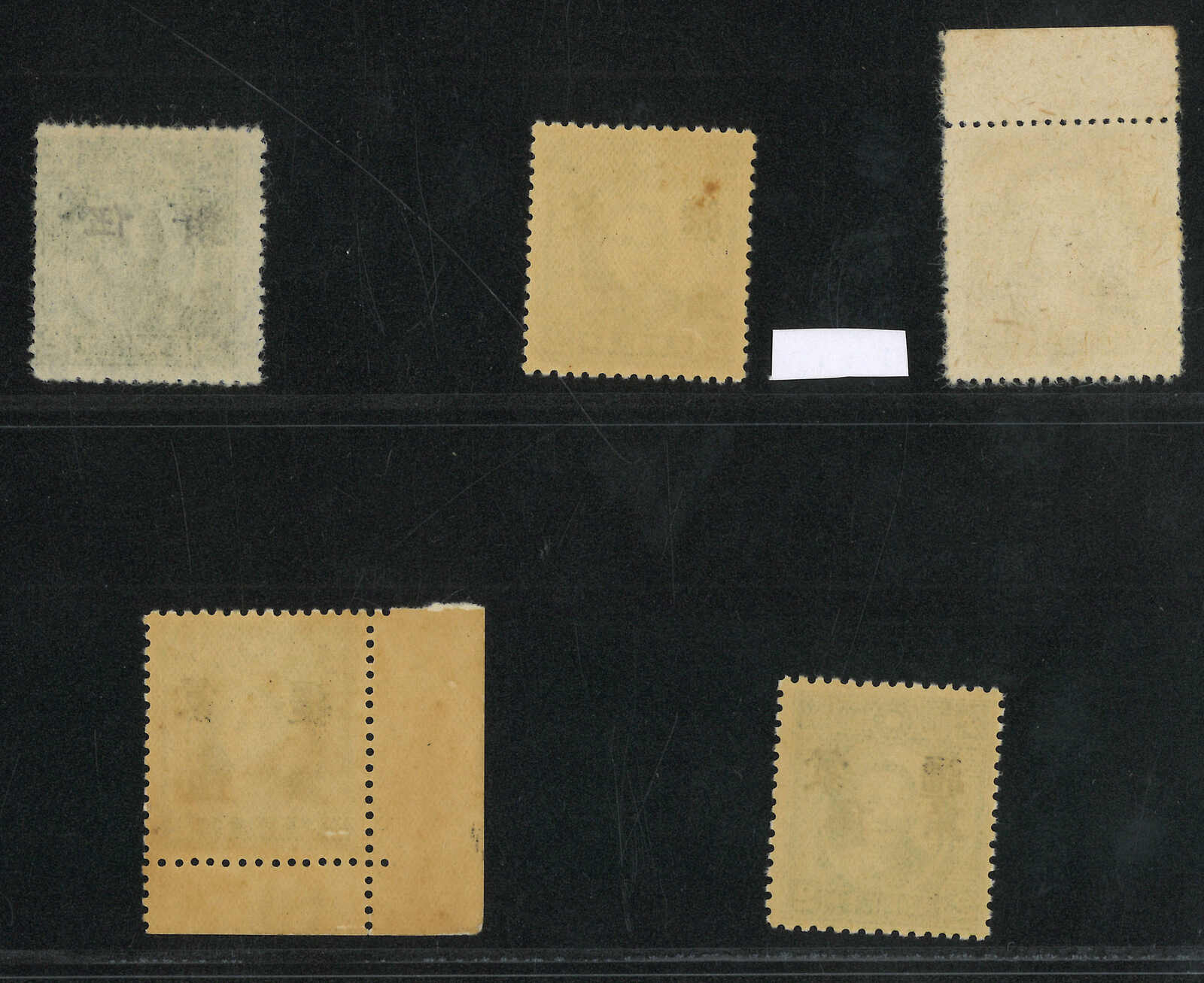 1945年北京版烈士半分加蓋大字“蒙疆”再改值1角正常票及變異票共五枚(陳目JM190),展示了改值移位及“角壹”變異。原膠無貼。(Image 1)