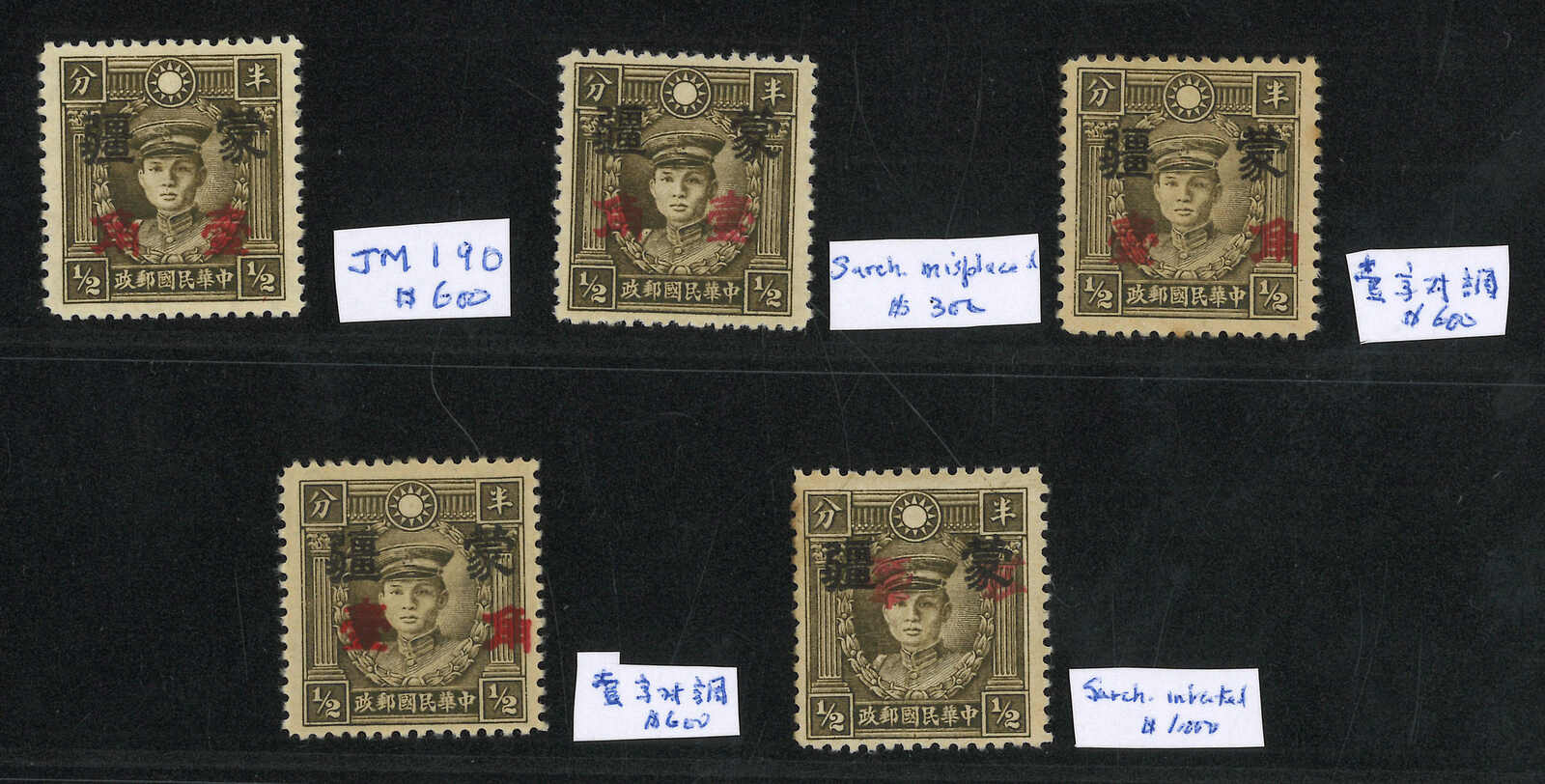 1945 Peking Print Martyrs 1/2c ovpt. large figure “Mengkiang” and re-surch 10c normal and variety stamps in a group of 5 (Chan JM190), showing surch shiftd variety. MH with original gum.