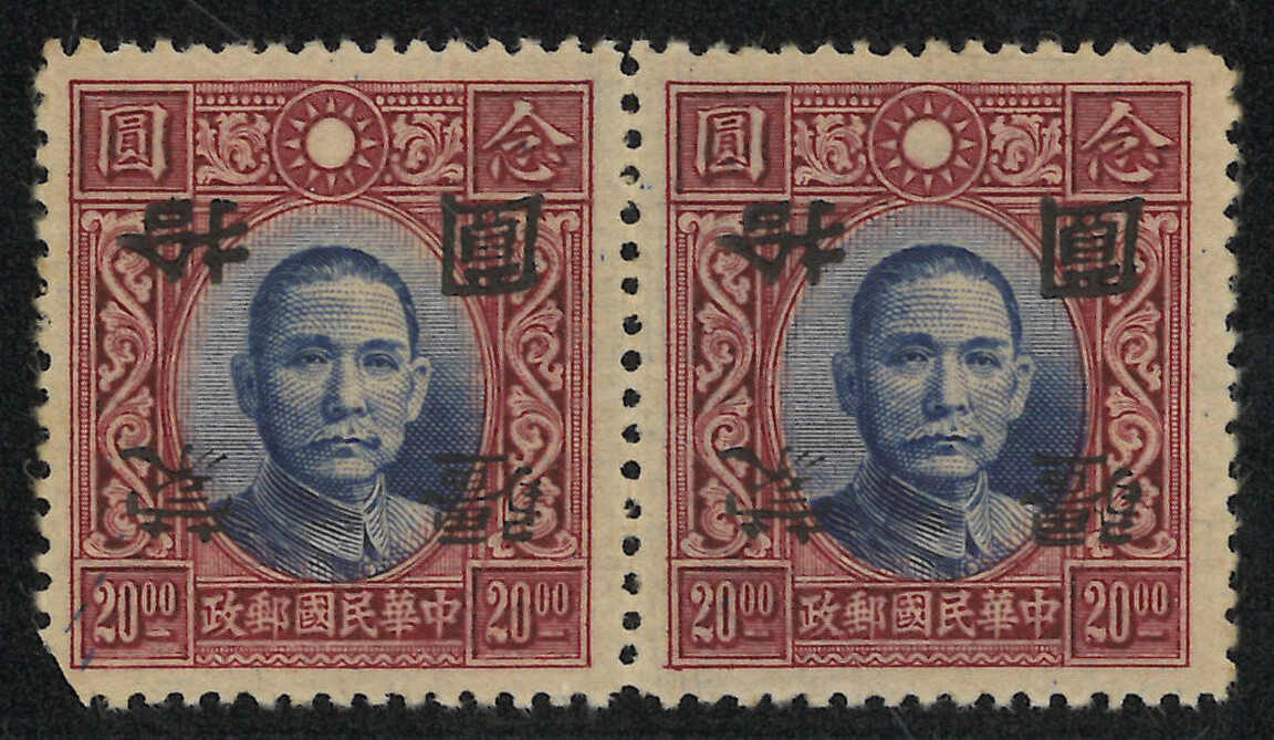 1942年日佔蒙疆加蓋半值10元,蓋於大東版無水印孫像20元橫雙連新,帶加蓋倒蓋變異(陳目JM118),原膠無貼。(Image 1)